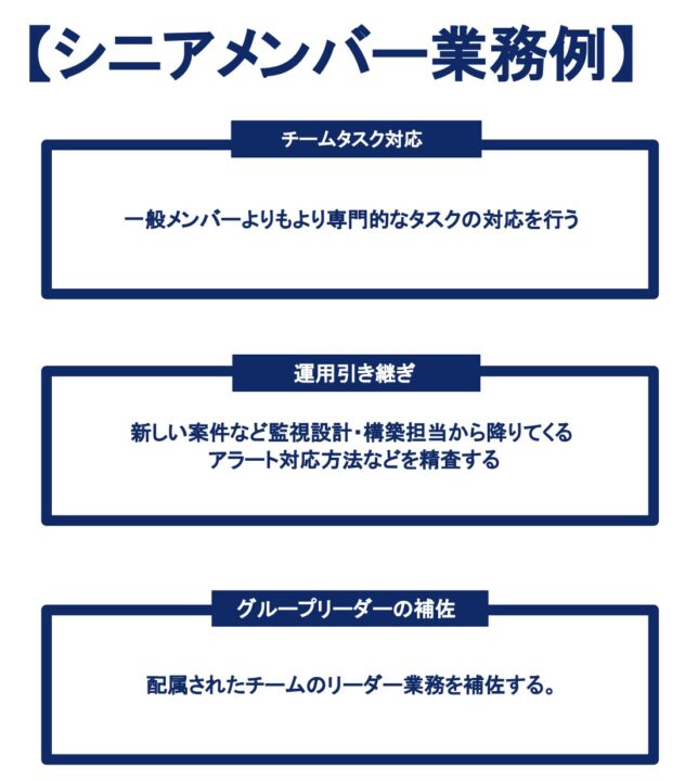 今回ご紹介しているシニアメンバーは一般メンバーの業務に加え、大きく分けて3つの業務があります。