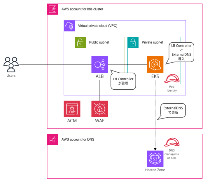 EKS クラスターが存在するアカウントとは別のアカウントで Route 53 のホストゾーンを管理する、クロスアカウント構成を採用しました。