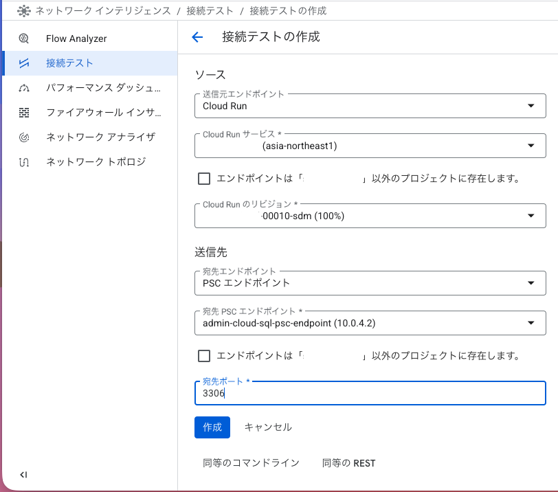 疎通の確認方法としては、Google Cloudのコンソール上に「接続テスト」いう機能があり、それを利用しました。