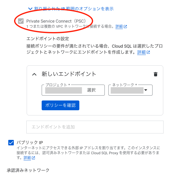 これでCloudSQL側からプロジェクトAに対してアクセス許可を出し、許可したプロジェクトからのみエンドポイントが作成されます。