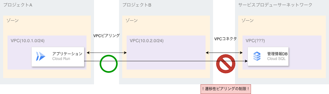 つまりVPC AからVPC Bへ移動、その後VPC BからGoogle管理VPCのCloudSQLへ移動しようとすると推移性ピアリングの制限に引っかかる訳です。