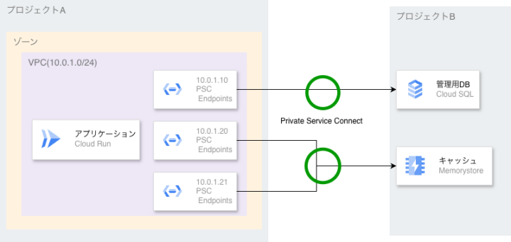 PSCはプロジェクト・VPCの内外を問わず繋げる経路であり、その末端PSCエンドポイントをアクセスしたい側のVPCにプライベートIPを付けてデプロイします。