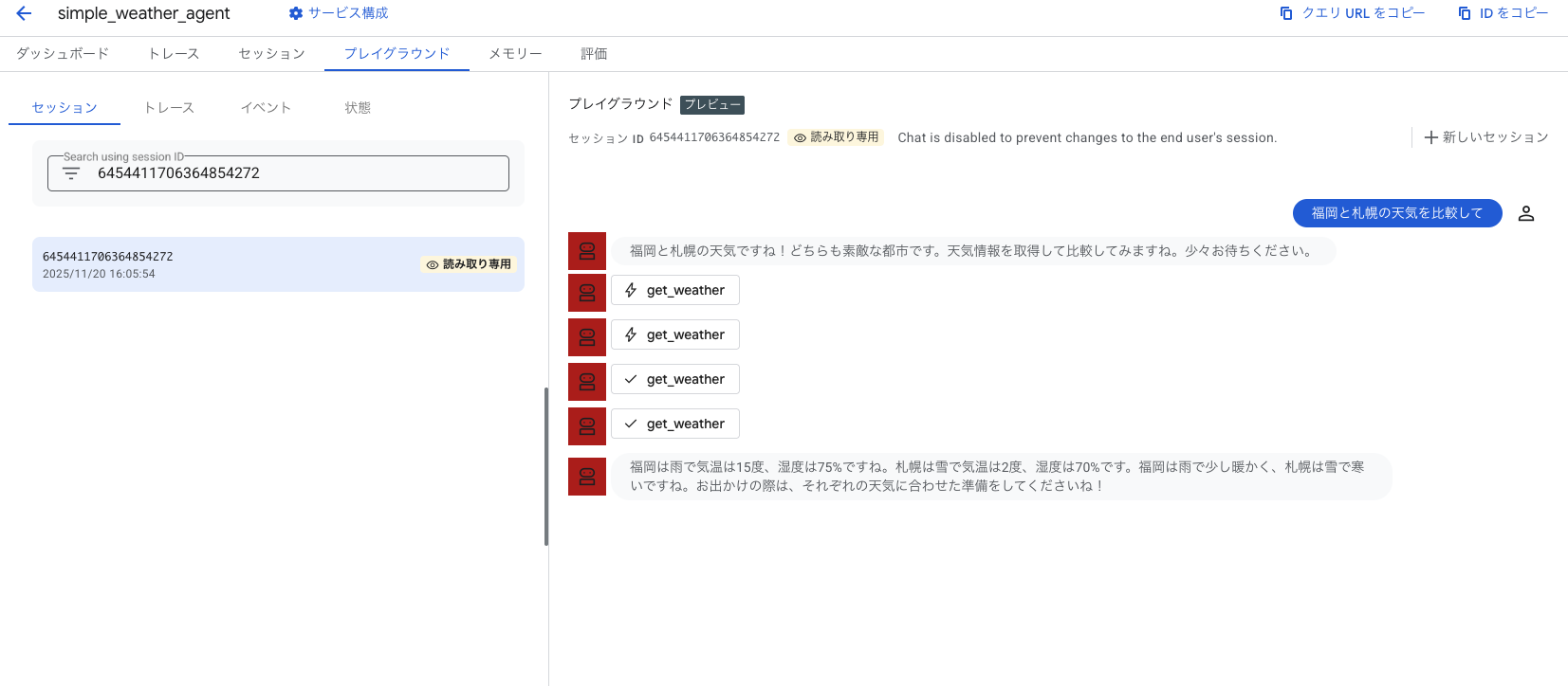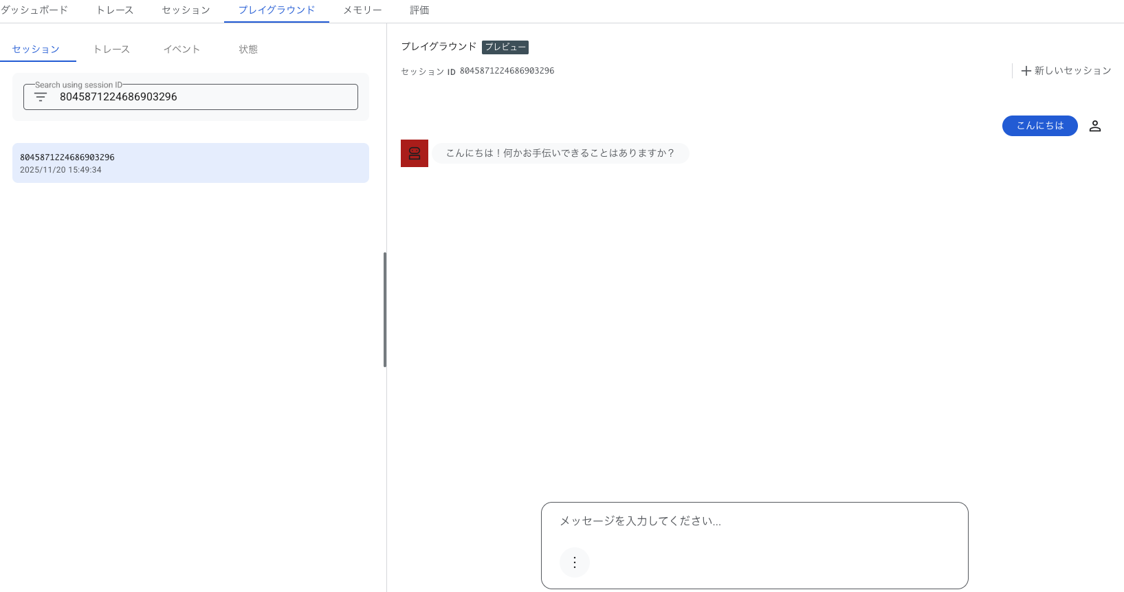 「プレイグラウンド」という画面が追加されています。この画面から、チャット形式でデプロイしたエージェントと直接会話しながら、手軽に動作確認を行うことができます。