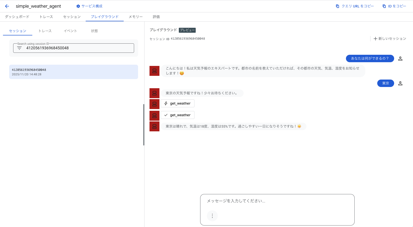 デプロイした Agent Engine にアクセスすると、以下のような画面が表示されます。