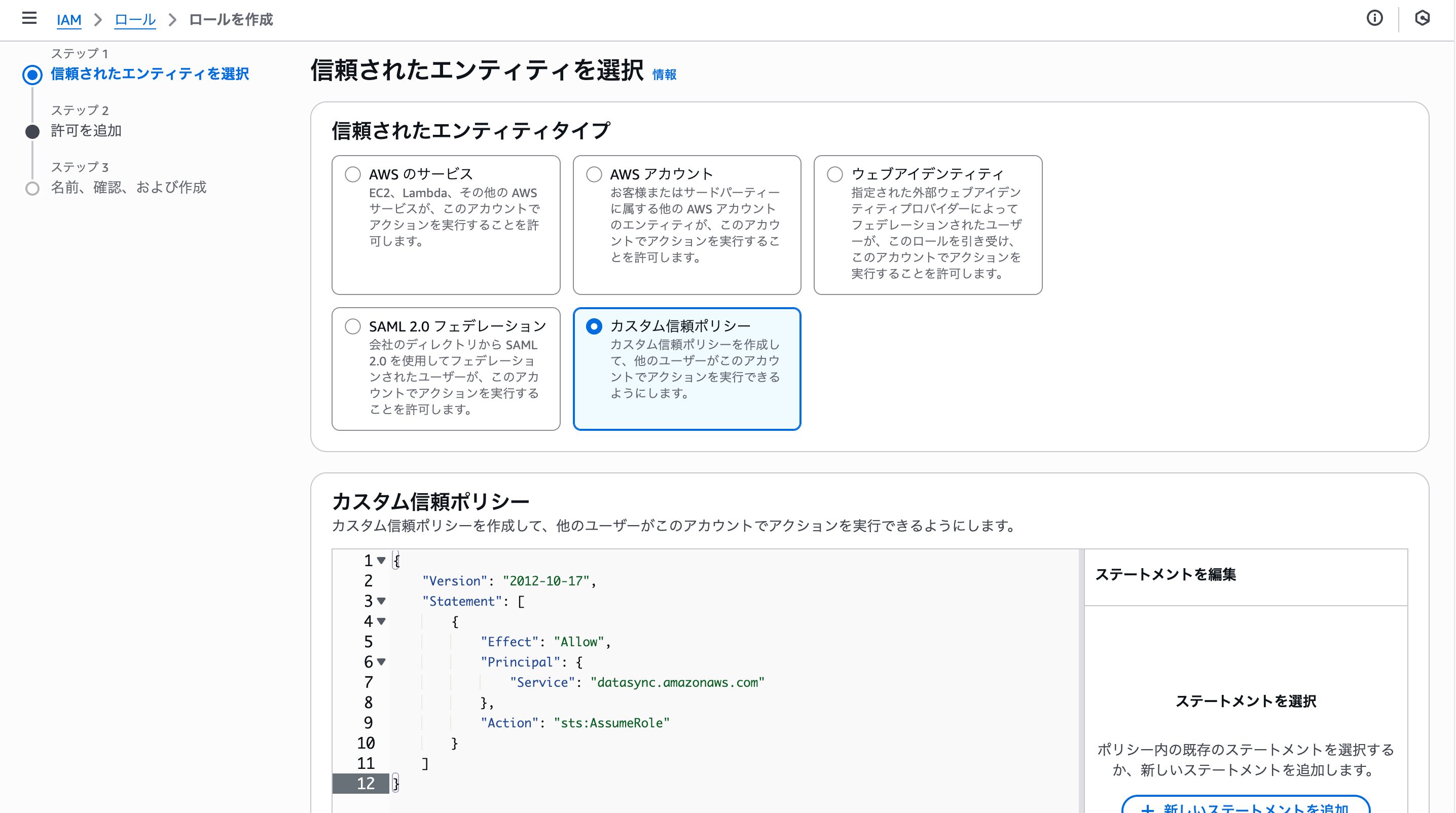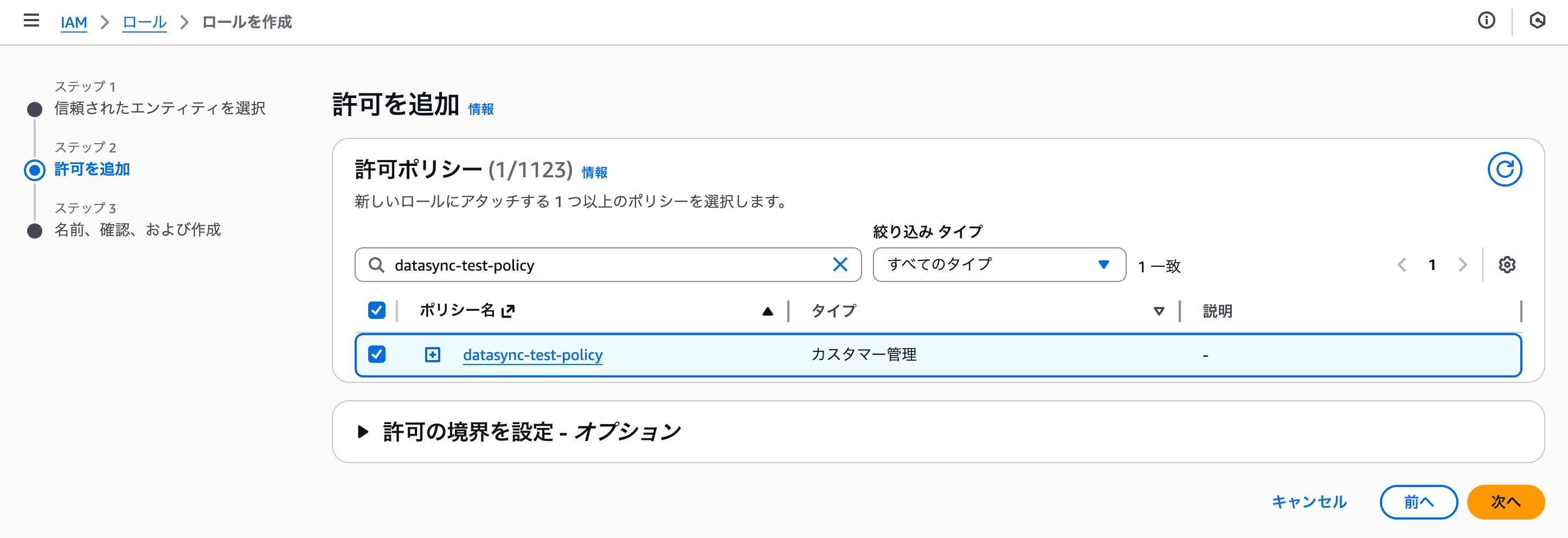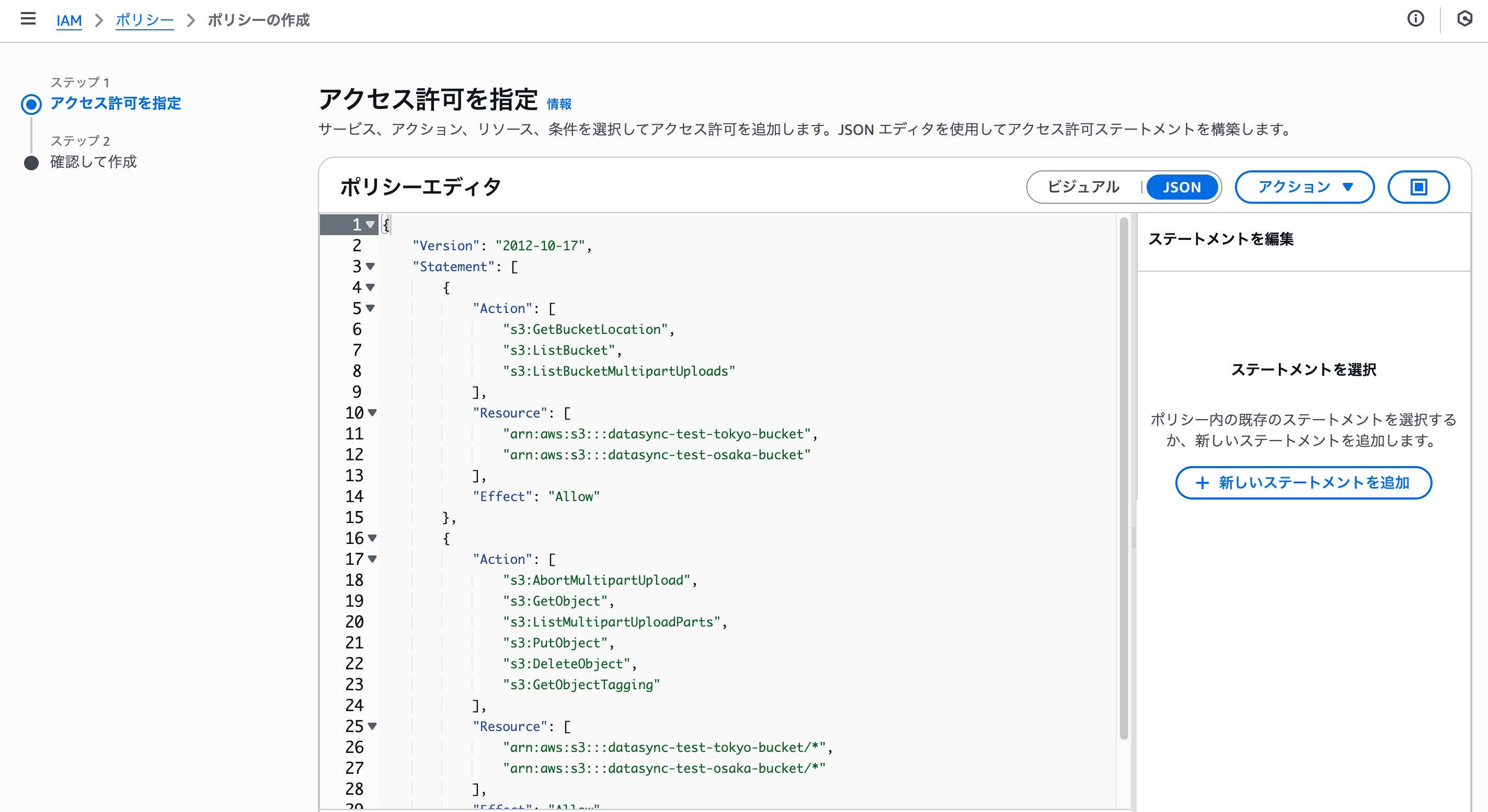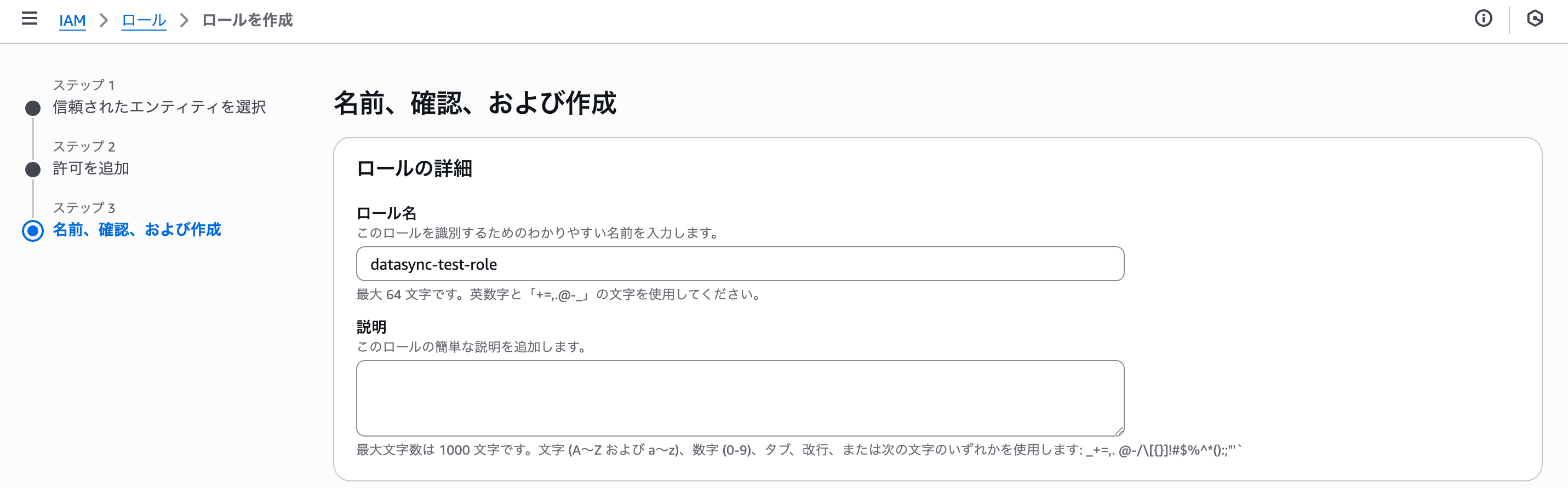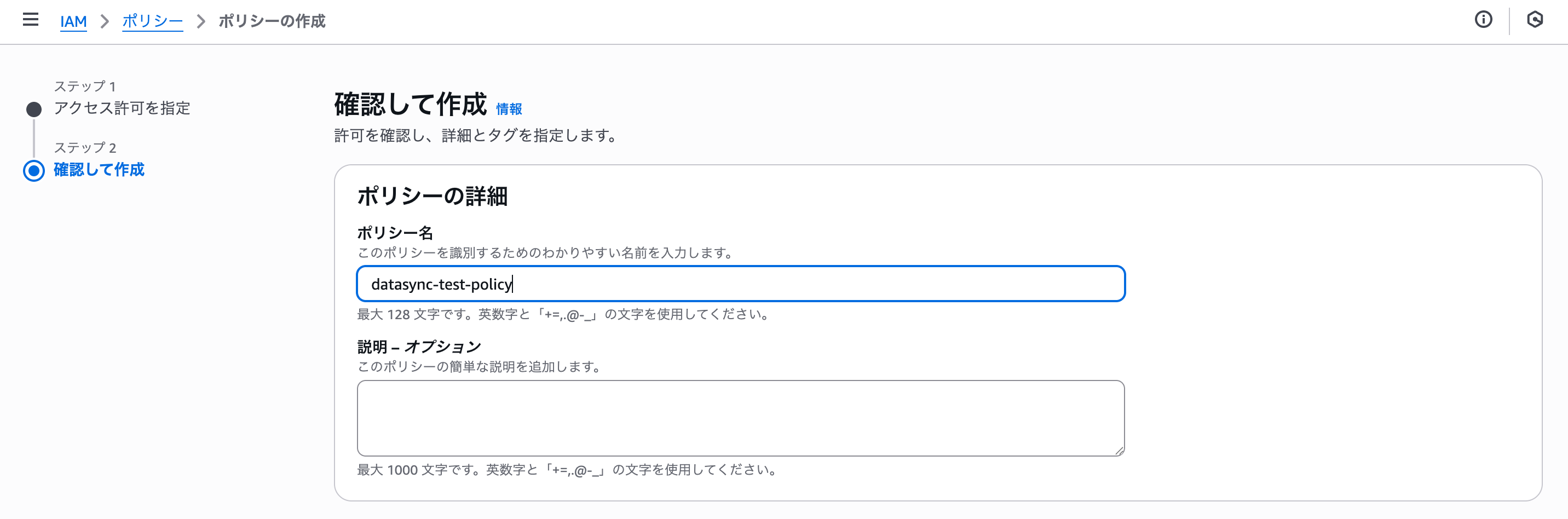 S3に対して、DataSyncから読み書きなどの操作をするため、必要なIAMポリシーを作成し、IAMロールにアタッチします。