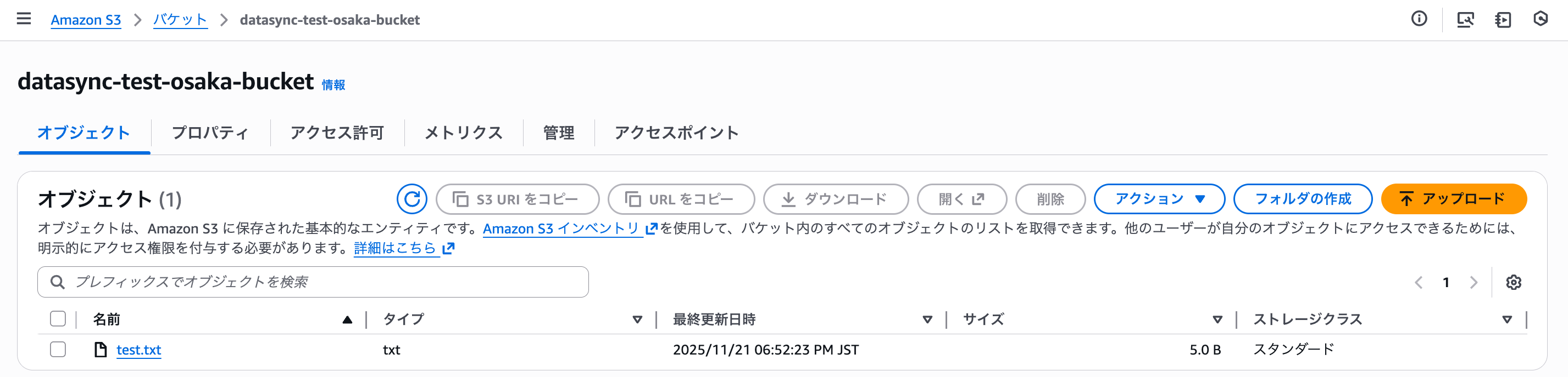 - 大阪リージョンのS3に test.txt が転送されたことが確認できました。