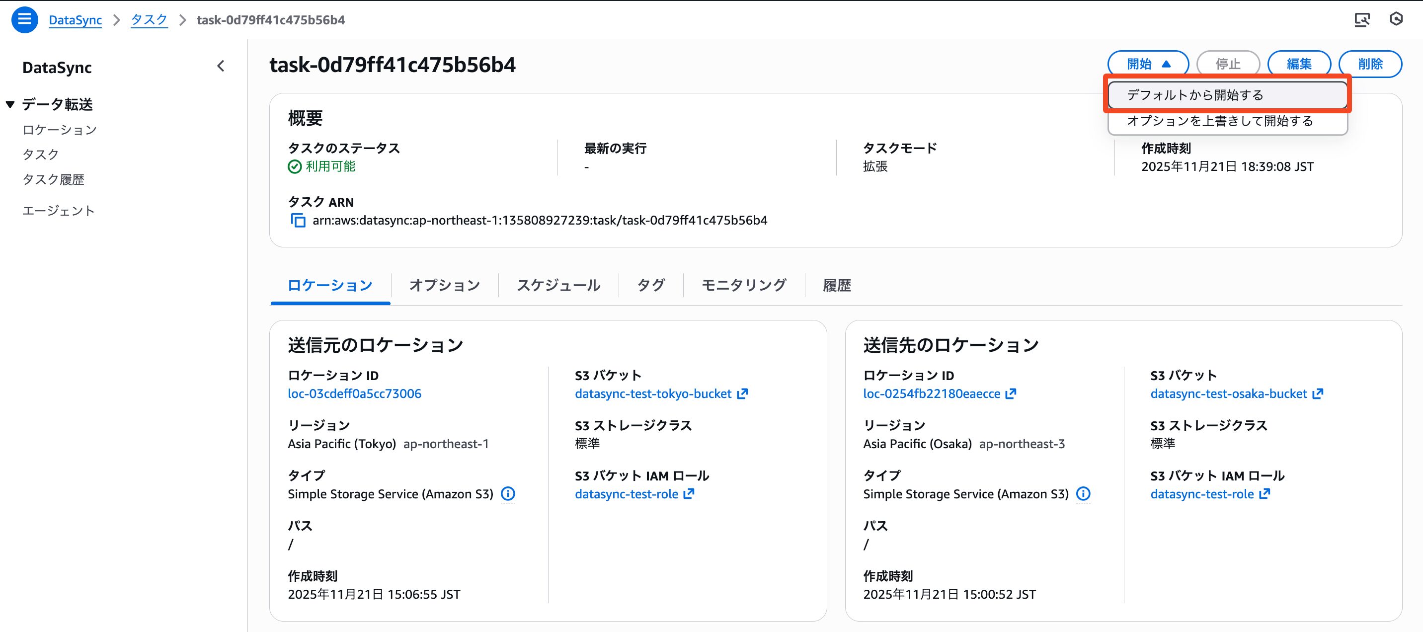 - DataSyncタスクの右上に開始 > デフォルトから開始する を押下します。