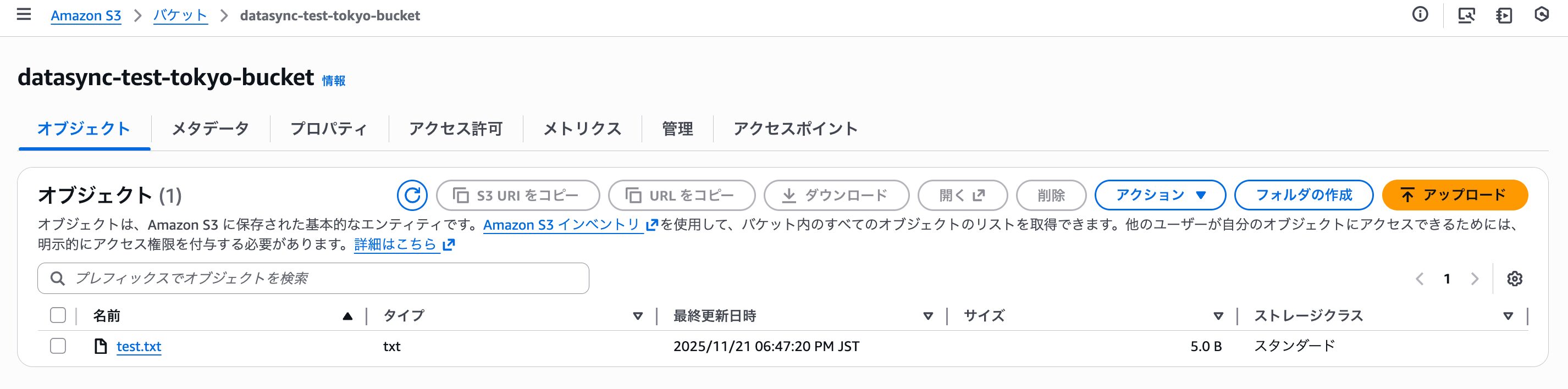 - 東京リージョンのS3にtest.txt をアップロードします。