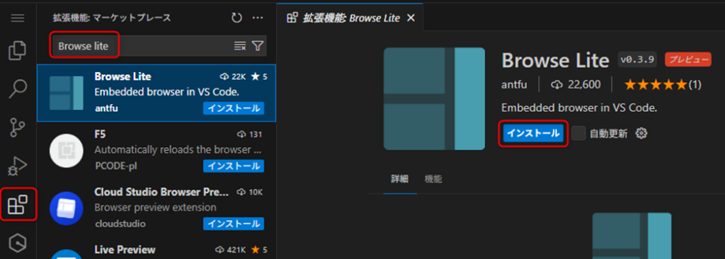 VSCodeへ”Browse Lite”という拡張機能を導入して、VSCode上のブラウザからWebアプリケーションへのアクセスを実現します。
