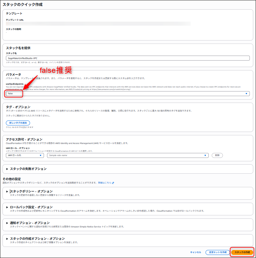 - デフォルトのまま「スタックの作成」選択で問題ありません