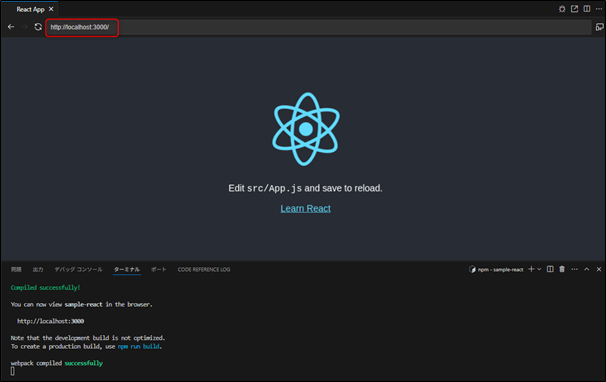 VSCodeのターミナルからWebアプリケーションを稼働させて、[localhost:port]でリクエスト待機状態のアドレスへアクセスします。