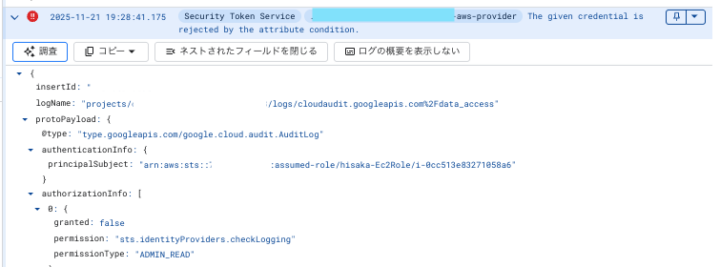 すでに記載した通り、属性マッピングは単純 (google.subject=assertion.arn) にしておき、属性条件 (Attribute Condition) で、「この Role 以外は認めない」という設定を入れます。これにより、許可していない Role からのアクセスは弾かれます。もしアクセス元 Role が増加するようであれば、こちらのメンテナンスが必要となります。 -