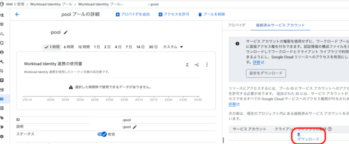 上記の設定まで終わると、接続済みサービスアカウントのコンソール画面から、接続時に利用する構成ファイルをダウンロードすることが可能になりますので、ダウンロードしておきます。