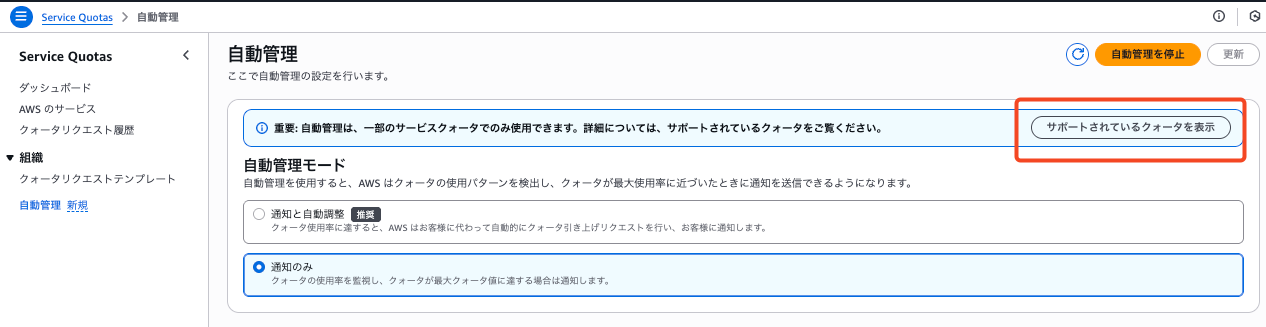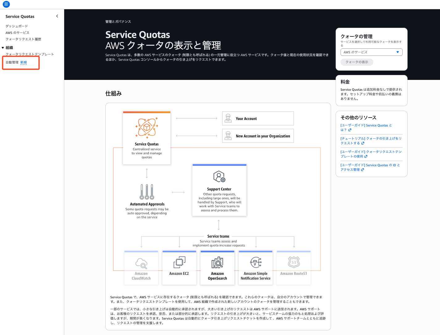 AWS Service Quotas のコンソールにアクセスしてみると、左ペインに「自動管理」というメニューが追加されています。