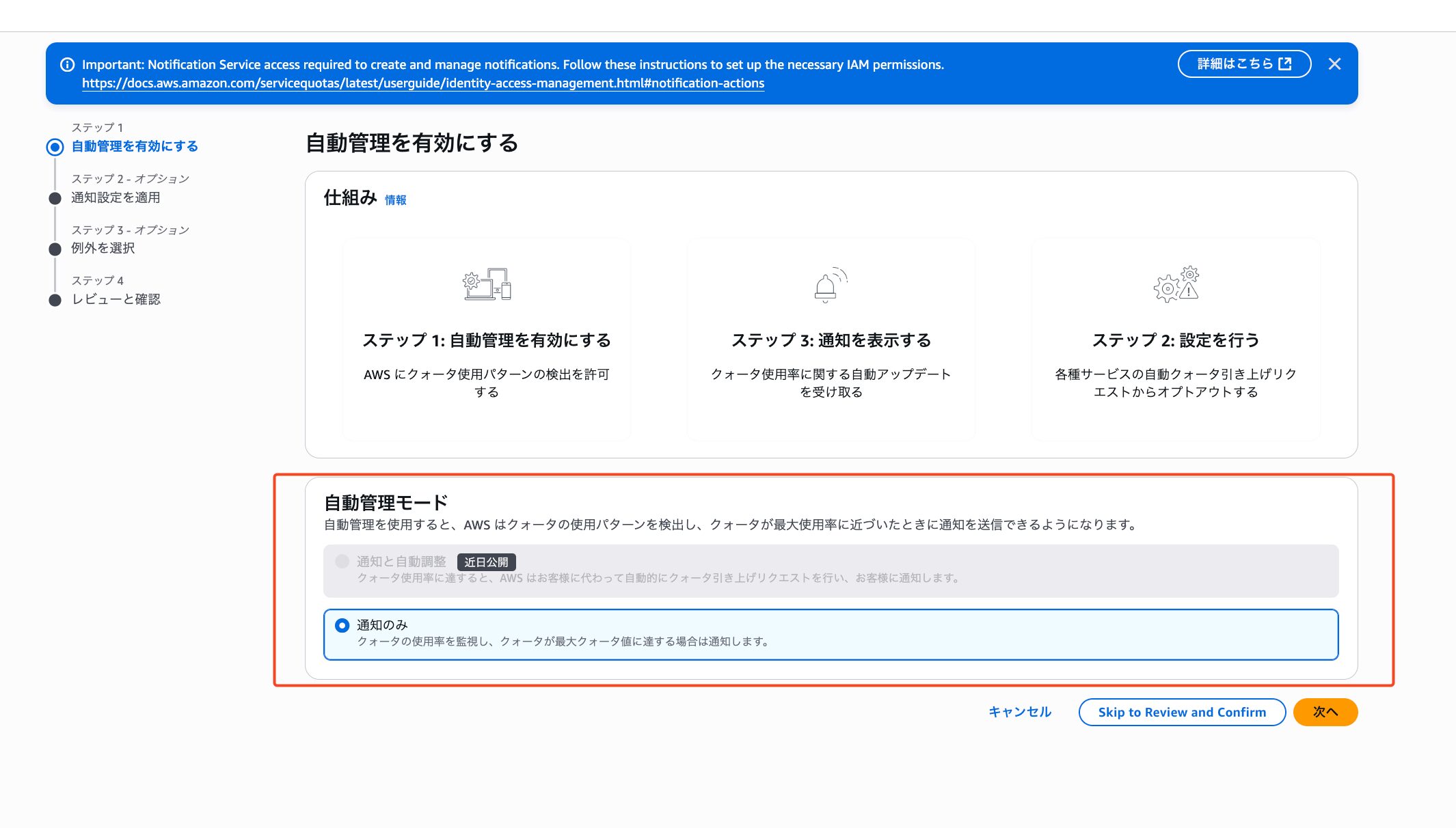 「ステップ1 : 自動管理を開始」画面が表示されました。