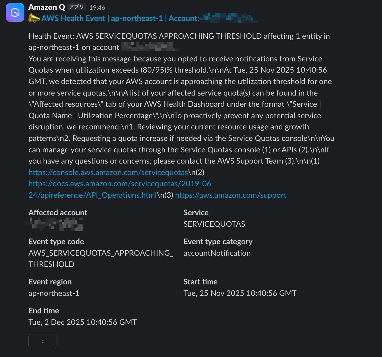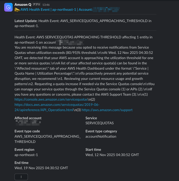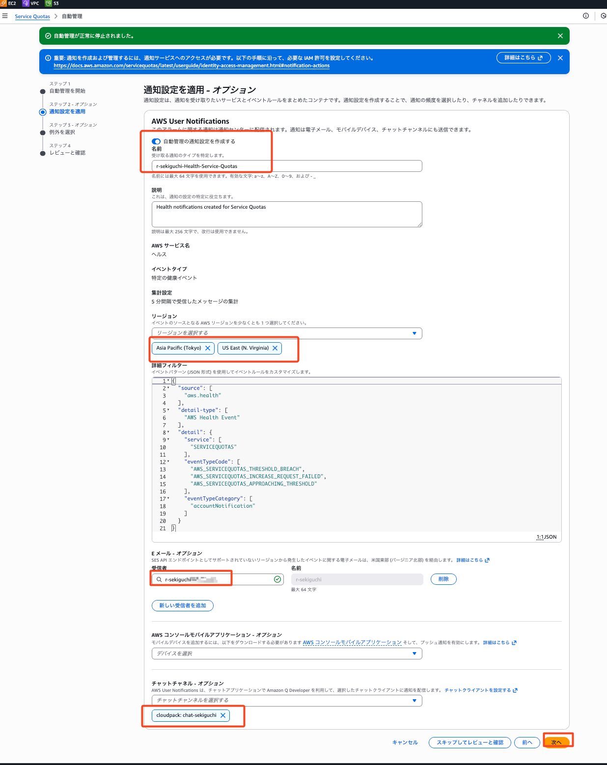 - チャットチャネル : Amazon Q Developer で設定した、 Slack チャネルへの通知設定を選択