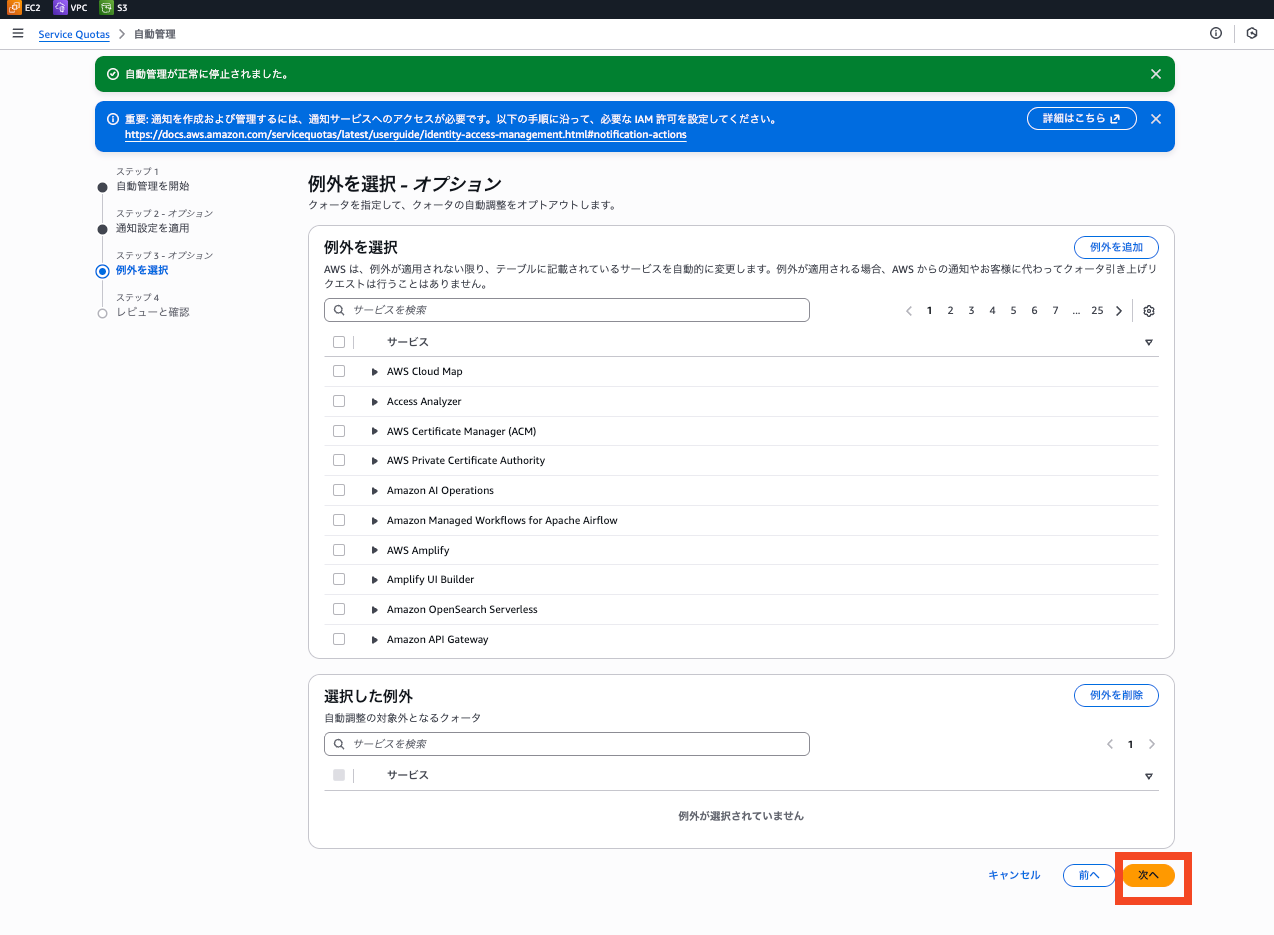 サービスクォータのコンソールにアクセスし、左ペインから「自動管理」をクリックします。