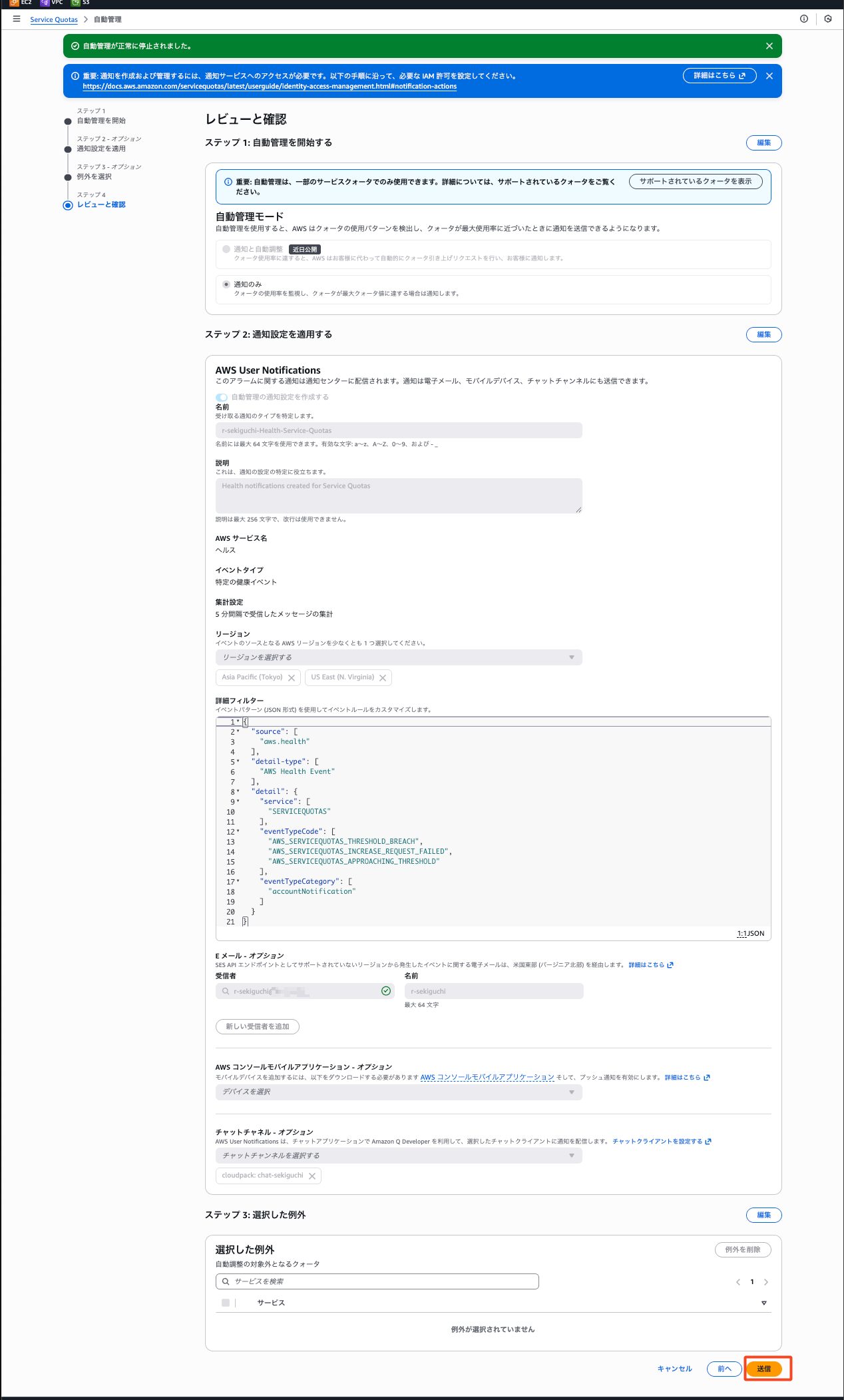 「ステップ4 : レビューと確認」画面が表示されるので、内容を確認して「送信」ボタンを押します。