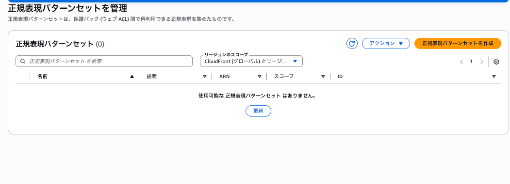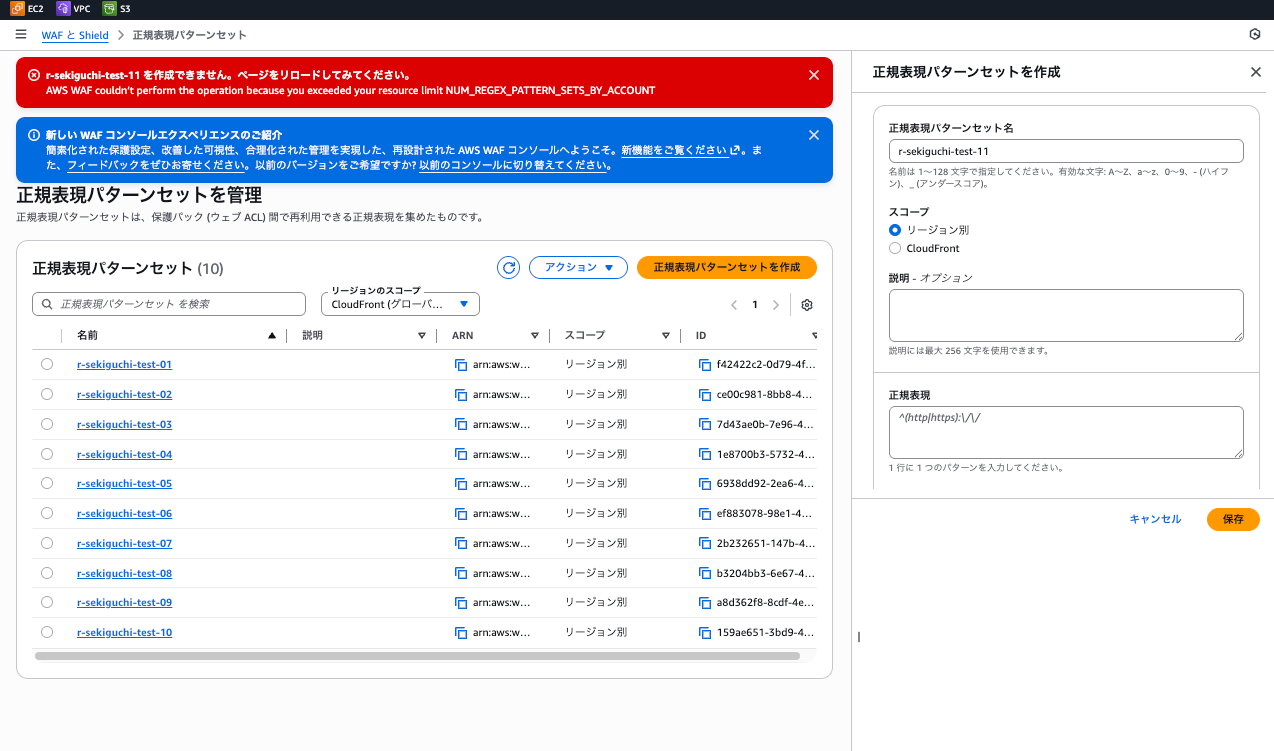 デフォルトではリージョンごとに作成できる正規表現セットの最大数は10となっています。
