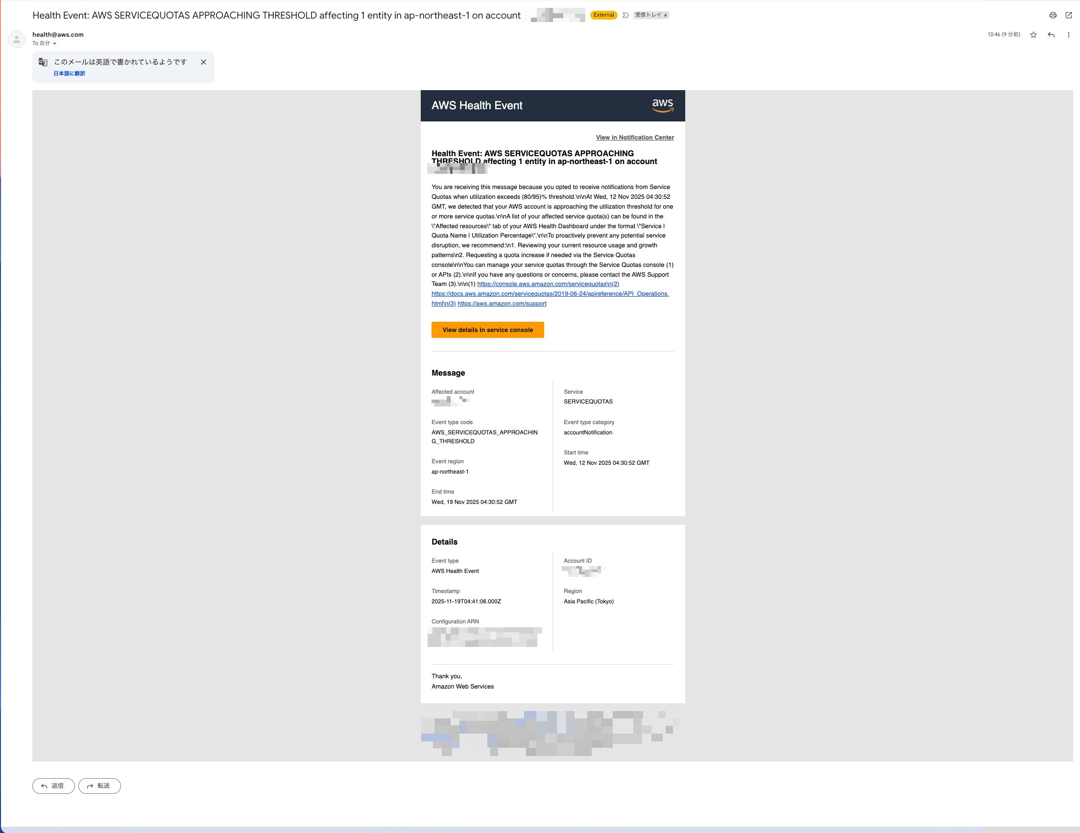 - 現在のサービス利用量がクォータに近づいていることを検知