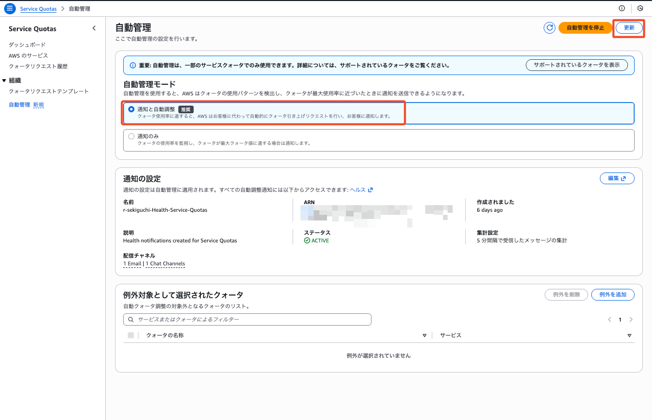 既に自動管理モード : 「通知のみ」で設定しているので、これを「通知と自動調整」に変更して、「更新」をクリックします。