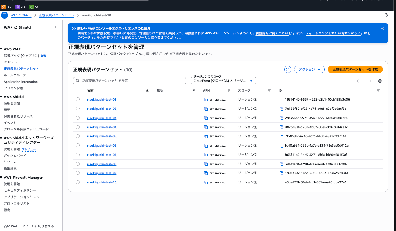 東京リージョンで正規表現セットを上限の10セット作成し、通知が来るかを確認します。
