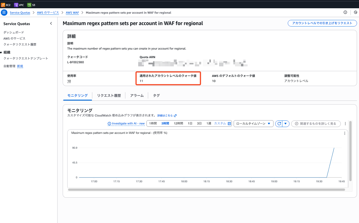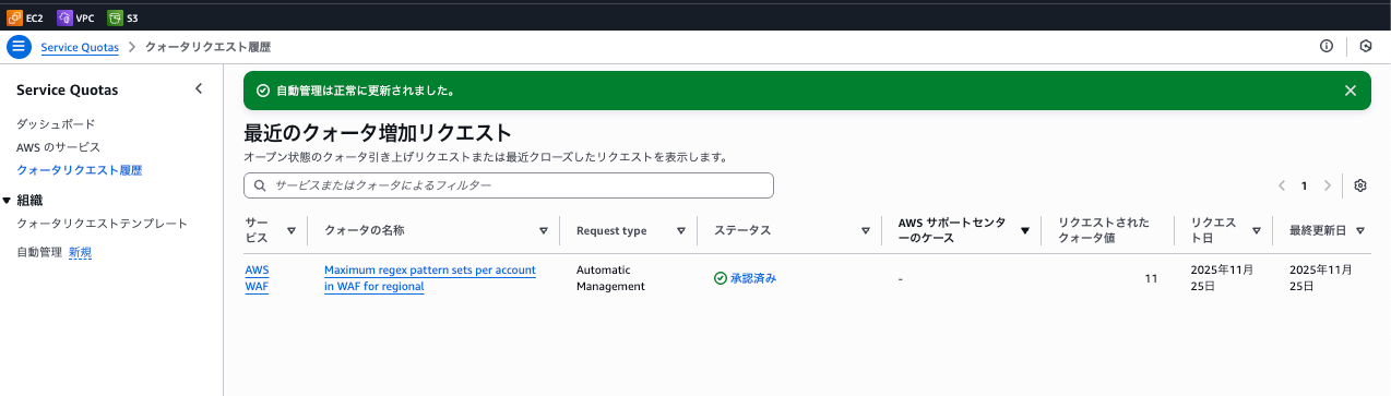 「最近のクォータ増加リクエスト」一覧の中に、Maximum regex pattern sets per account in WAF for regionalがあることが確認できました。