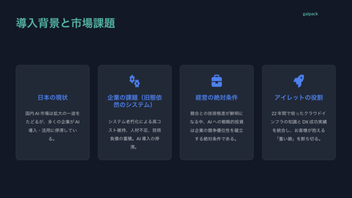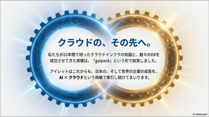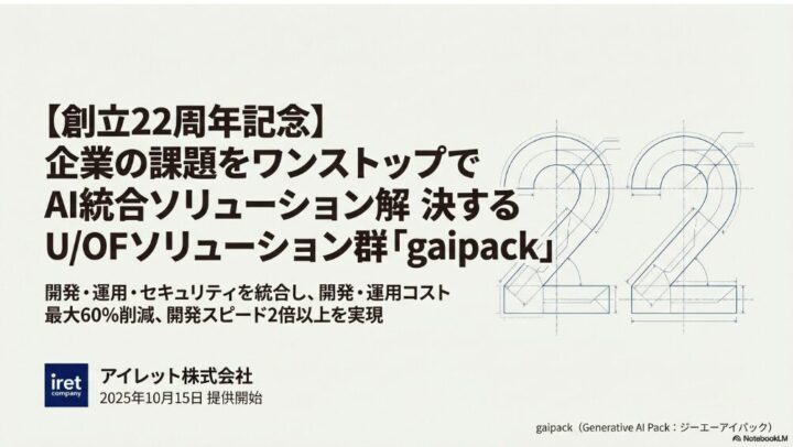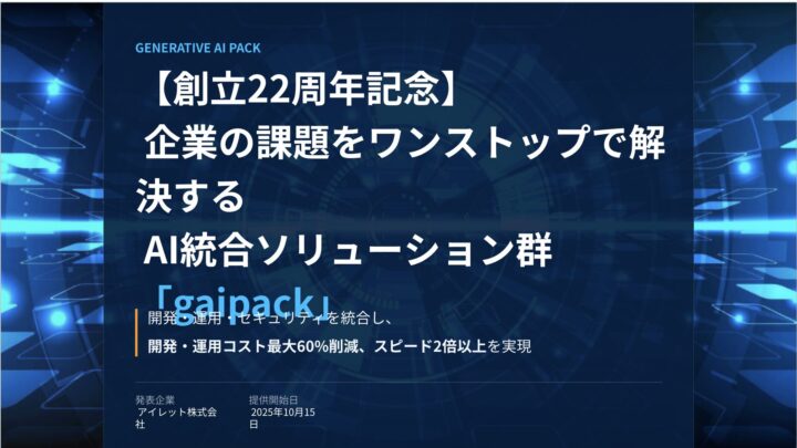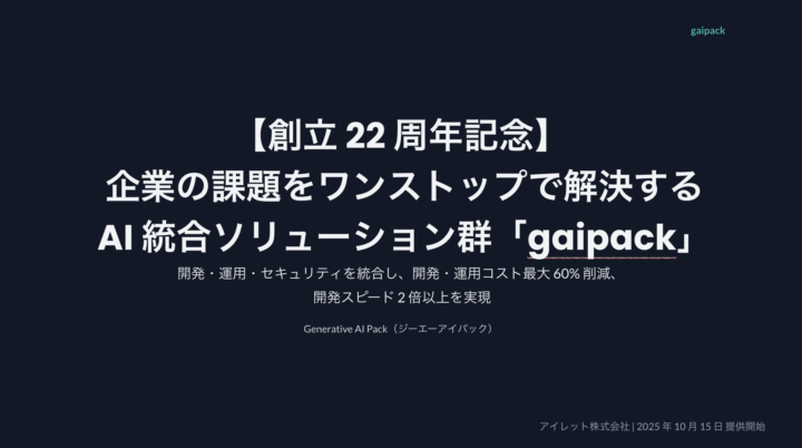 アイレットが2025年10月15日の創立22周年を機に提供開始した AI 統合ソリューション群「gaipack」は、AI とクラウドのアイレットの実績を融合させ、お客様の DX 推進と持続的な企業価値向上に貢献します。