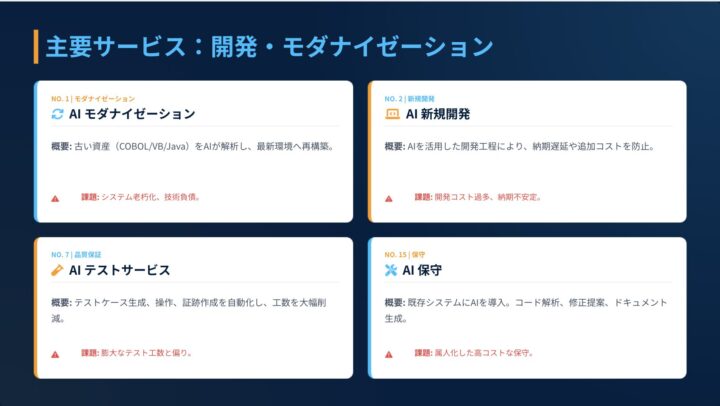 開発、運用、セキュリティ、ビジネス推進のすべてをカバーする全17種類(2025年11月現在)のソリューションで、お客様の生成 AI 活用を全面的にサポートします。