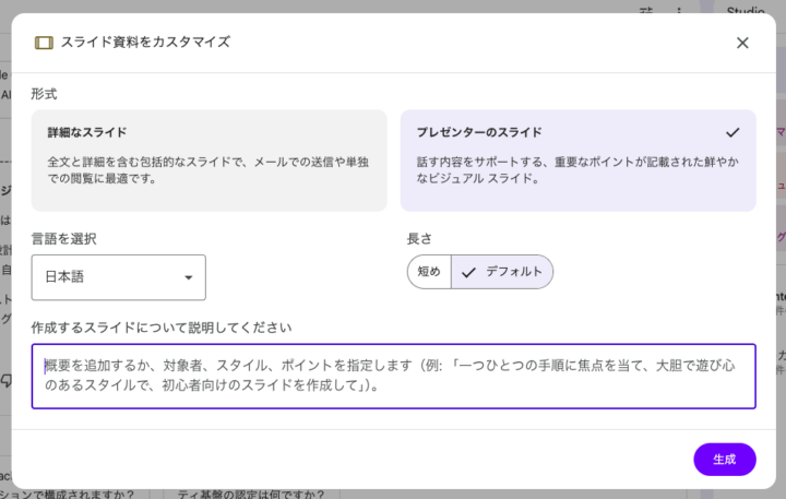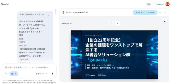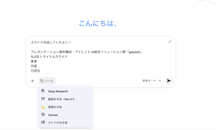 今回は、 Gemini でスライド作成を依頼した際に使用したプロンプトを入力して、