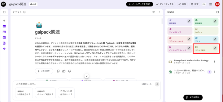 今回は、先ほど使用した「gaipack」のノートブックを開き、スライド資料をクリック!