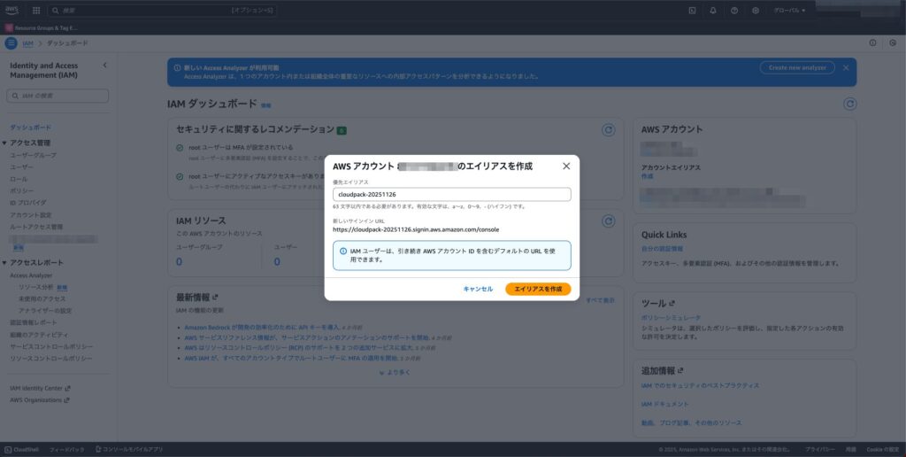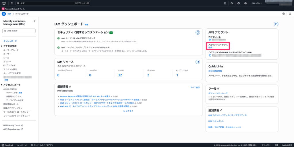 aws-nuke はアカウントエイリアス(別名)が設定されていないと実行できない仕様になっています。 まだ設定していない場合は、IAMダッシュボードから設定しておきます。
