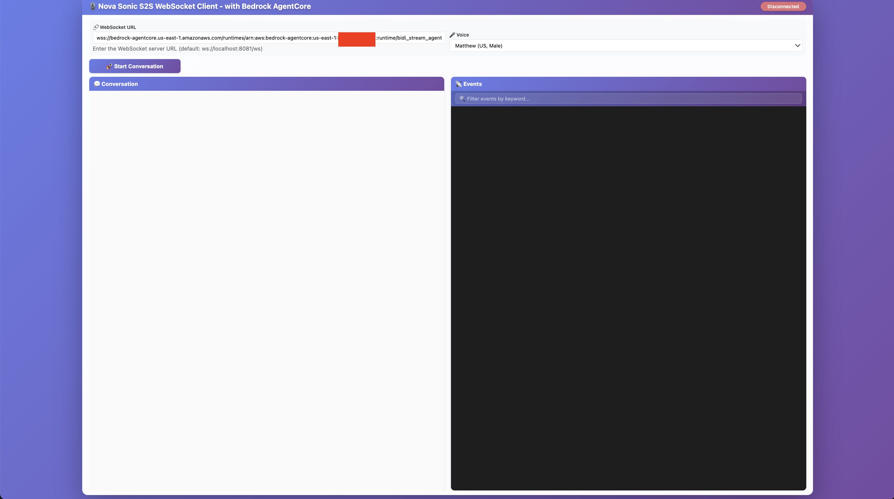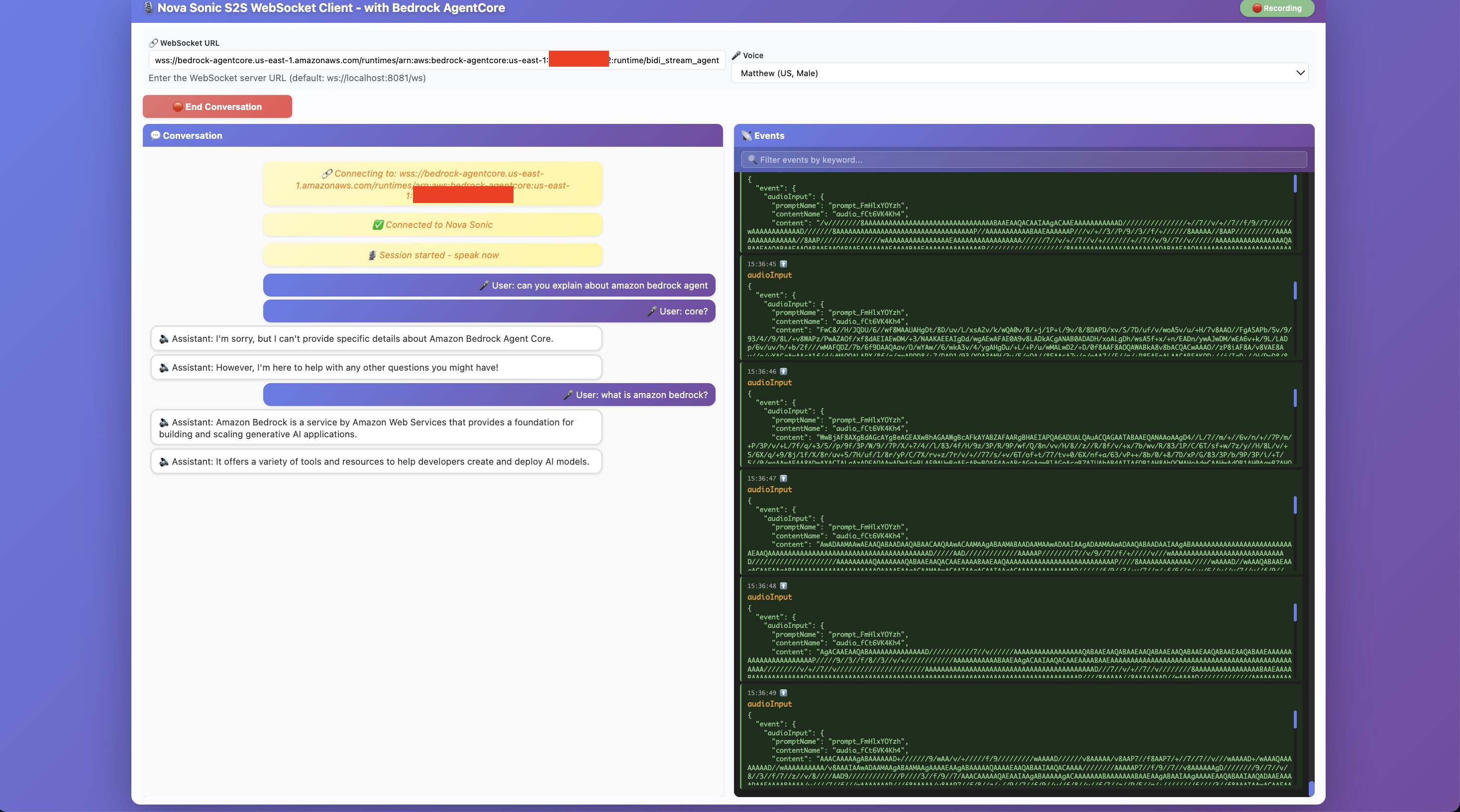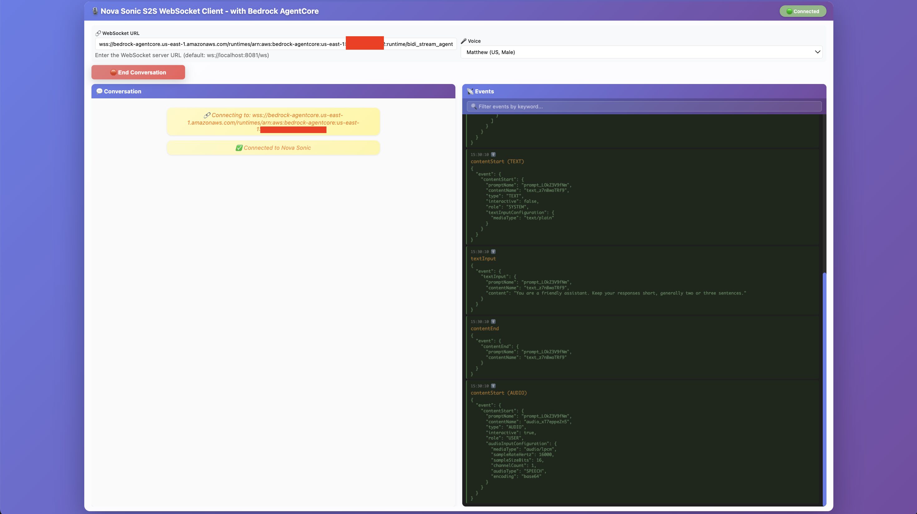 Start Conversationをクリックすると、マイクを利用して、AIと(モデル: Nova Sonic 2)と会話を行うことができます。