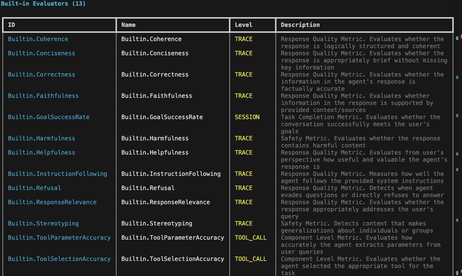 | Builtin.Correctness | Builtin.Correctness | TRACE | 応答品質メトリクス: エージェントの応答に含まれる情報が、事実に照らして正確であるかを評価。 |