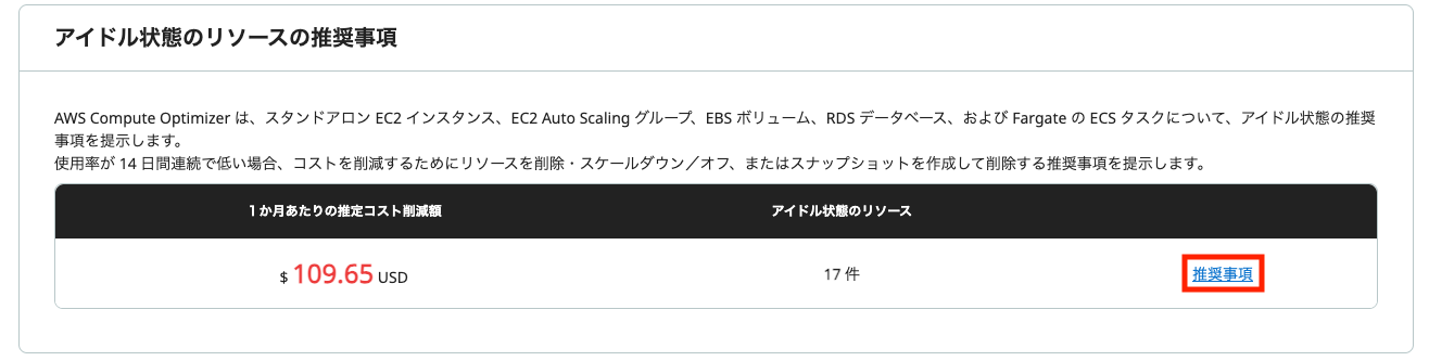 画面を少し下へスクロールすると、「アイドル状態のリソースの推奨事項」 という項目があります。