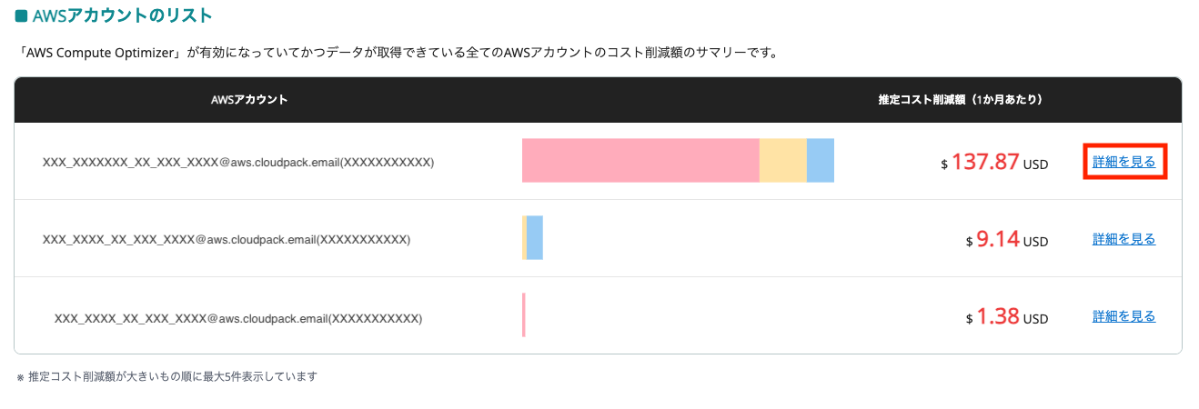 チェックしたいアカウントの行にある 「詳細を見る」 をクリックします。