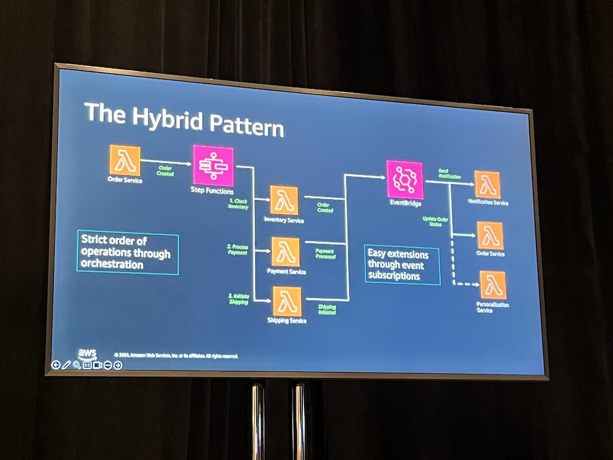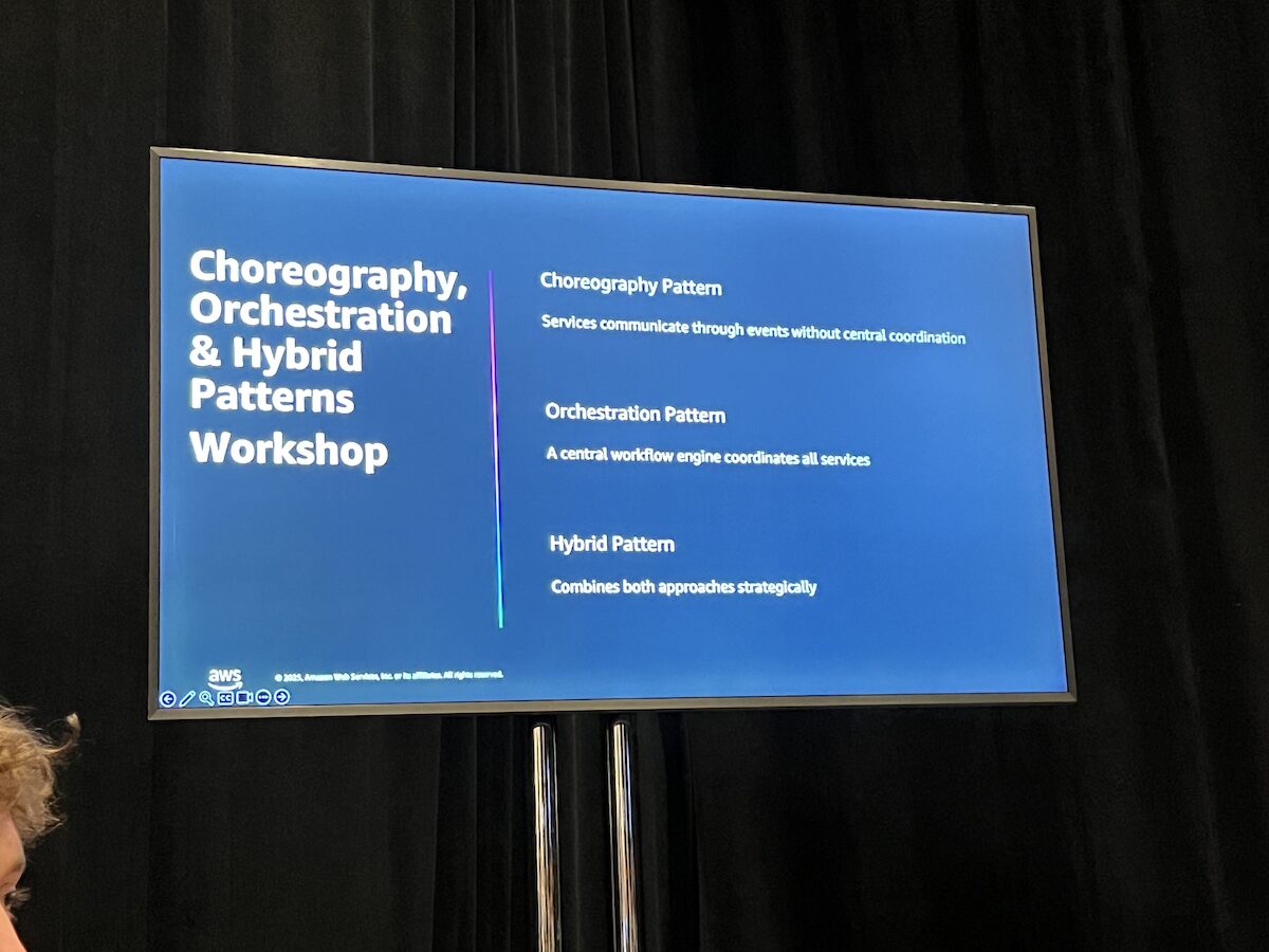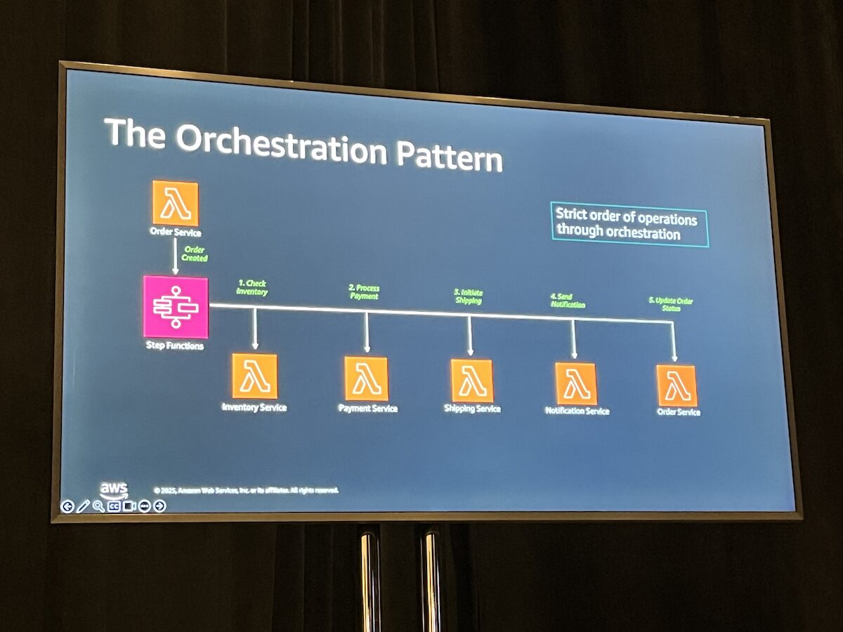 この記事は「Orchestration meets choreography: Building event-driven architectures [REPEAT] (ARC401-R)」のセッションレポートです。セッション時間に対してハンズオン内容は3時間で全然完走できなかったことが悔しいです。ハンズオン自体は完走していないので、セッション講師の方の解説をベースにレポートを記述します。