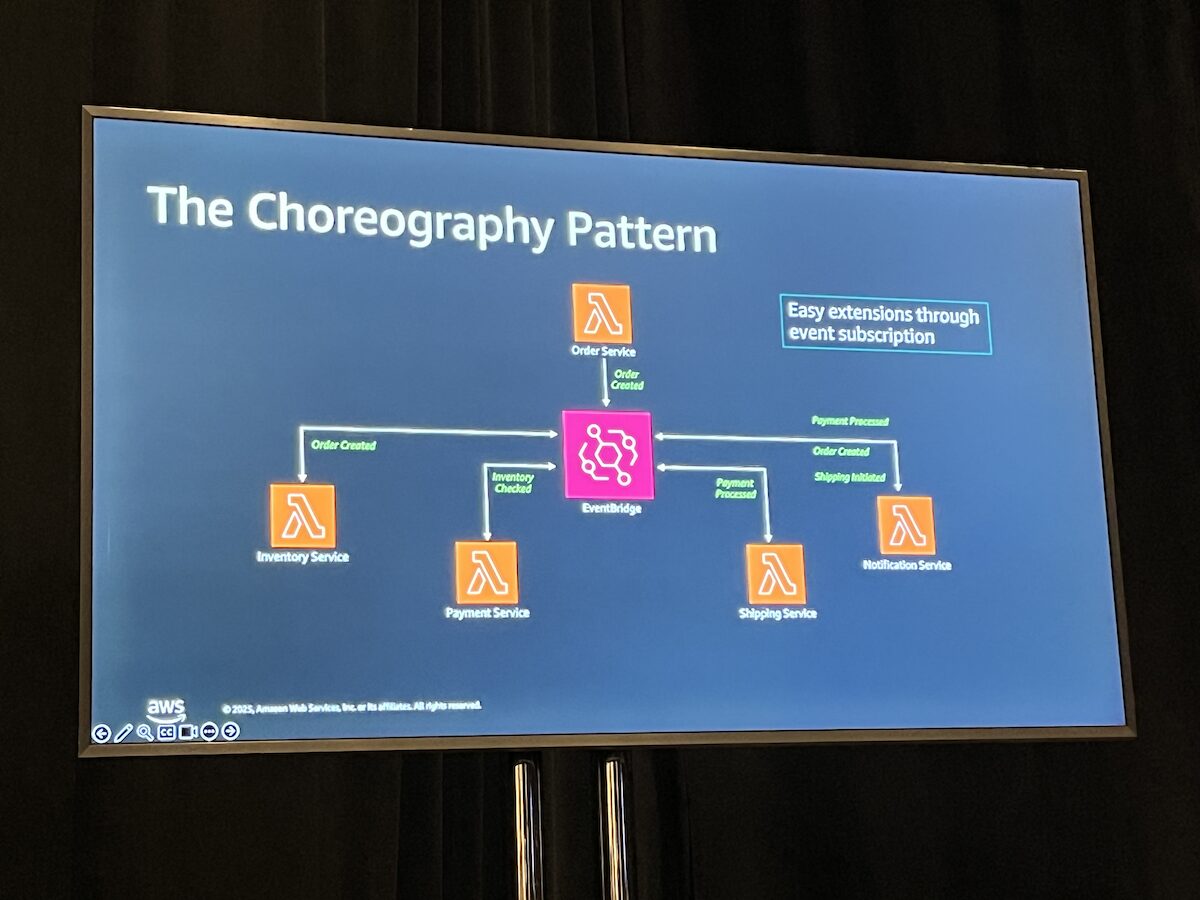 コレオグラフィーは、フロアにいる大勢のダンサーを想像してもらえればいいでしょう。誰も他の人の指示を聴いているわけではなく、みんなが独立して行動しているだけです。これはイベント駆動型であり、AWSではEventBridgeを経由することを意味します。注文サービスはイベントをEventBridgeに発行し、もうそれで終わりです。関与しません。インベントリサービスはそれをリッスンし、自分のタスクを終えたらまた立ち去ります。各サービスは互いに独立して行動しています。