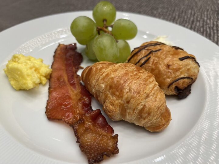 今見たらこれだけやけに写真うまくないですか?盛り付けがいいのかな、センスの光る朝ごはんです。味はカリカリベーコンが美味しすぎ、チョコのパンもワオって感じでした。マスカットは3粒くらいで満足したので同僚にプレゼントしました。