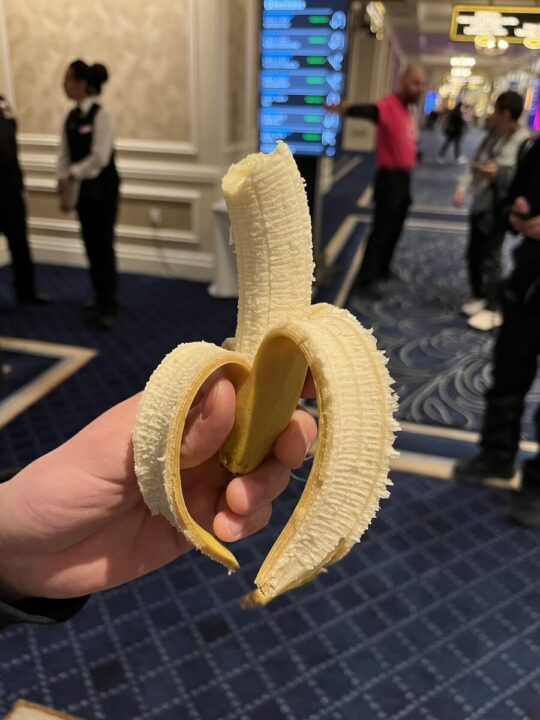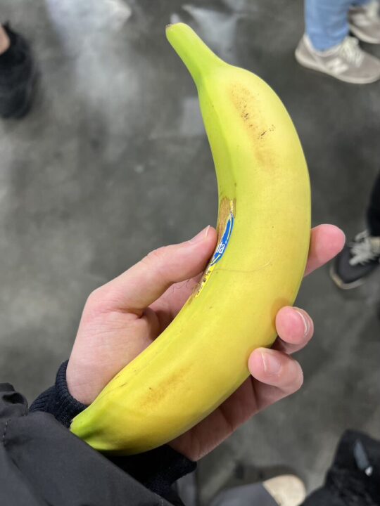 バナナを配っていたのでいただきました。久しぶりに1本丸々食べたな。自分のバナナは食べ切ってから気がついたので、これは他人のバナナです。あとバナナのバッジももらえました。