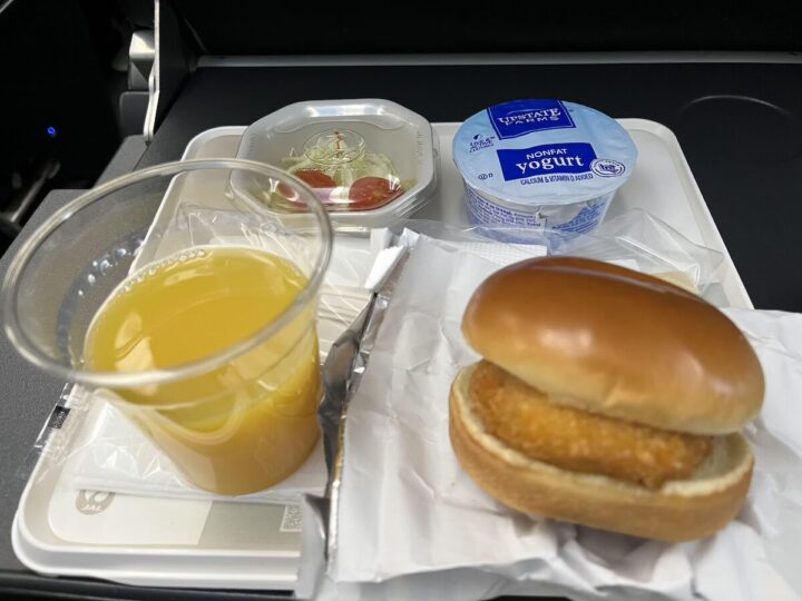 これはばっちり記憶にあります。コロッケバーガーと生野菜でした。サラダと書かなかったのは本当に切っただけの野菜だったからです。もしかしてバーガーに挟んで食べたら良かったのでしょうか。思いついても機内だと実践しなさそうです。