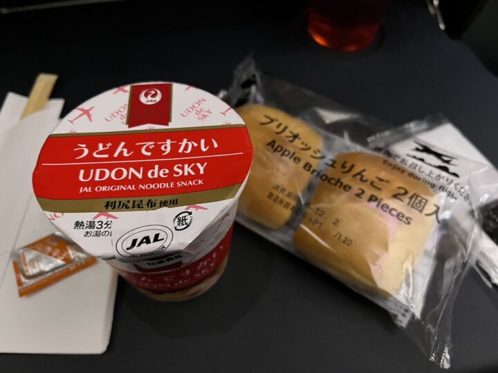 「うどんですかい(UDON de SKY)」とブリオッシュりんごパンです。JAL、”スカイ”が好きですね。どちらかというとこのりんごパンがはちゃめちゃに美味しかったです。クリームの中にりんごがちょろっと入ってました。
