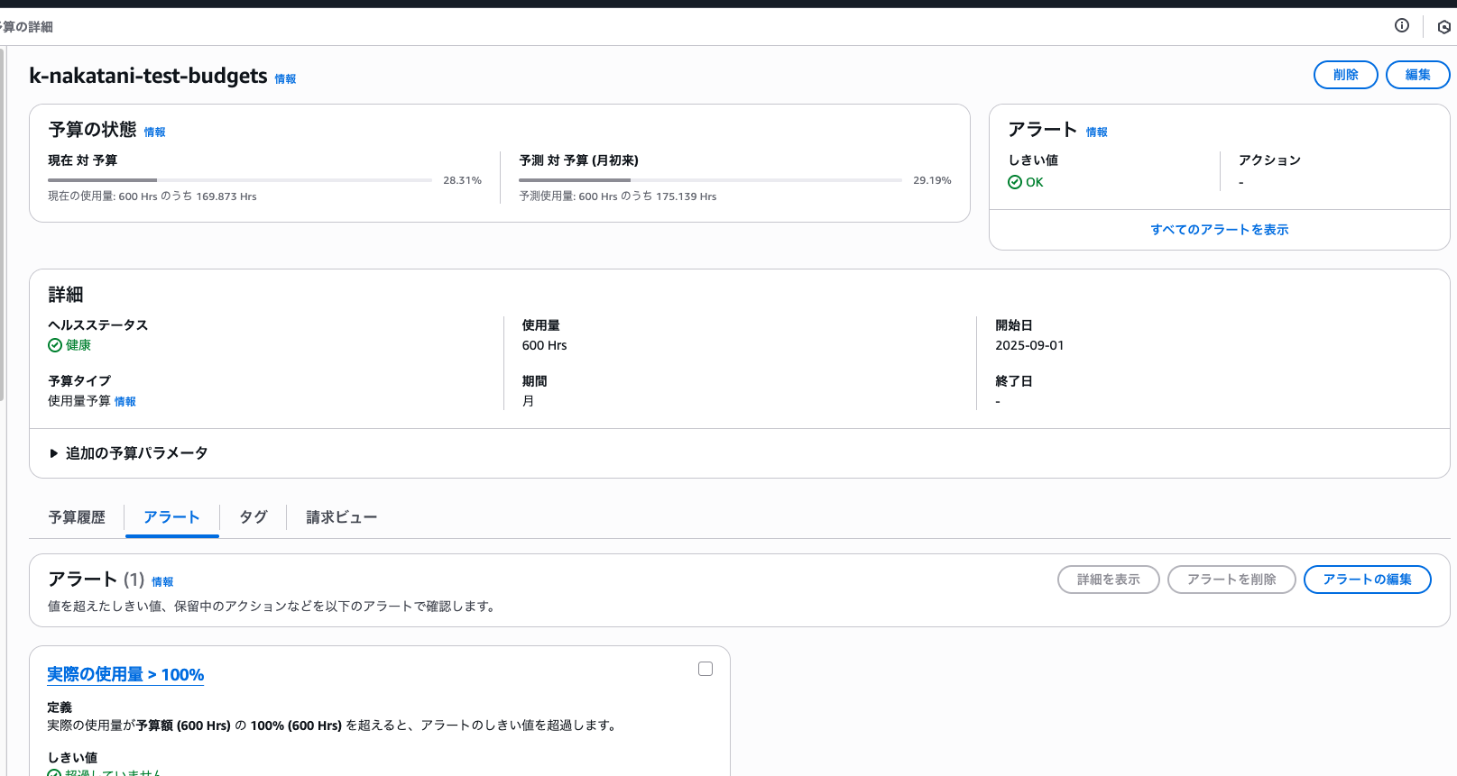 Budgetsで作成した予算の通知をSlackチャンネルに通知するように設定します。Budgetsの作成手順まで記載すると情報量が多くなることや、通知内容はBudgets以外にもCloudWatchやLambdaなど様々なサービスを関連付けて様々な用途でSlack通知を実現できるといった理由でBudgetsの活用手順は割愛します。