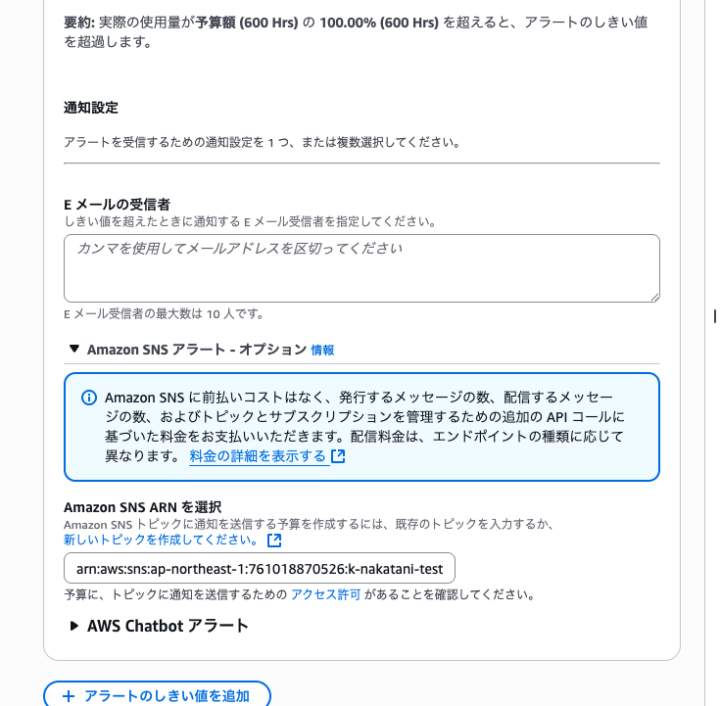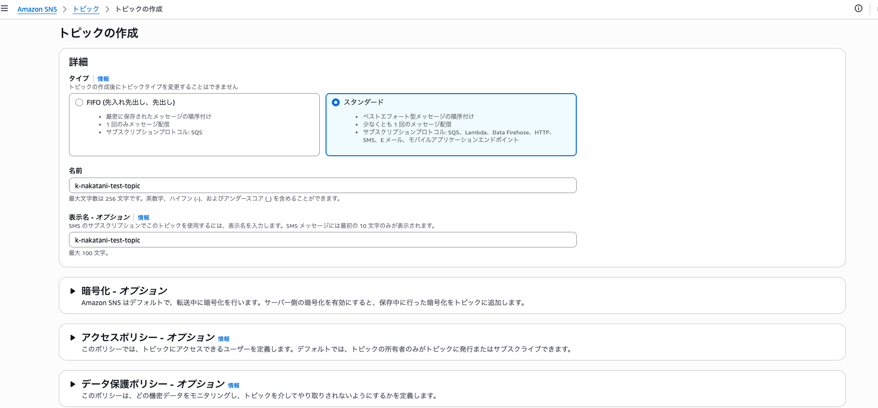 アクセスポリシー:デフォルト(他のサービスからSNSトピックを通知先として選択すると自動的に権限を追記してくれる)