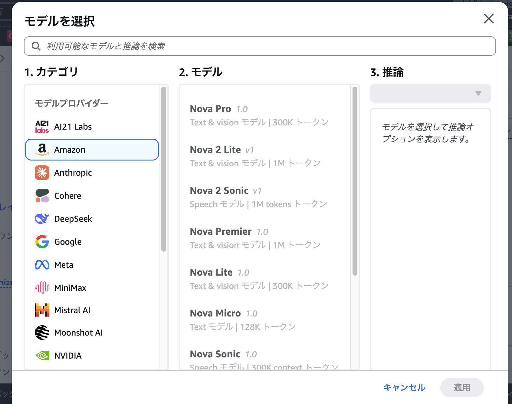 モデル選択に以下の2つの新しいNova2モデルが追加されています!それぞれ試していきましょう。