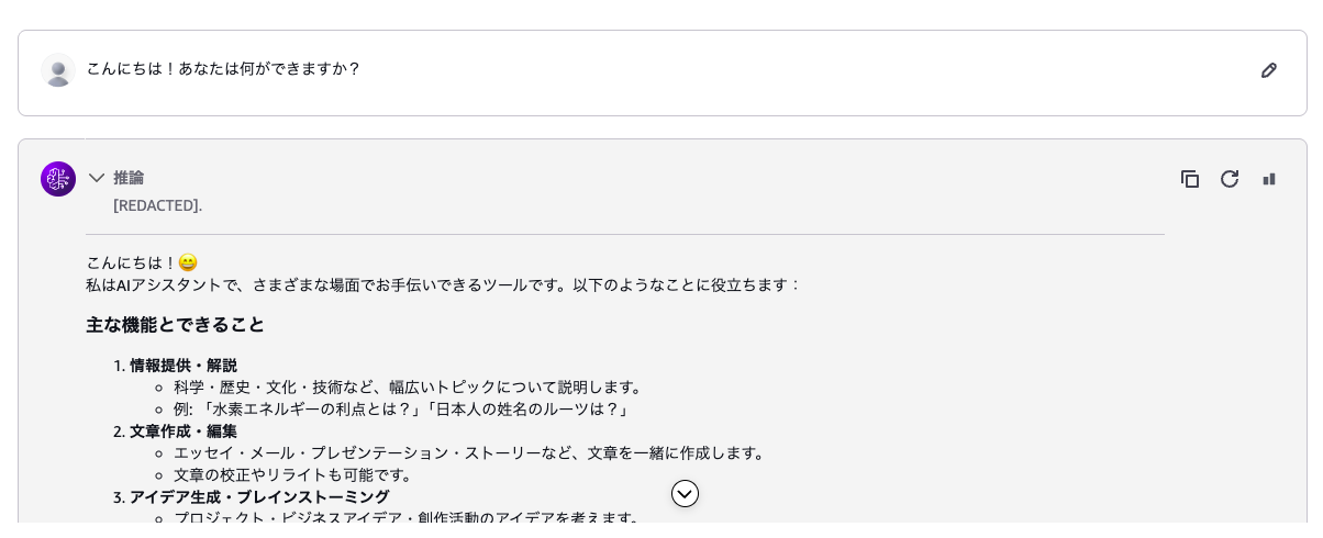 こちらも同様に聞いてみました。Nova 2 Sonicはモダリティがspeechなので会話感がより強いです。ダンディな声で優しく回答してくれました!