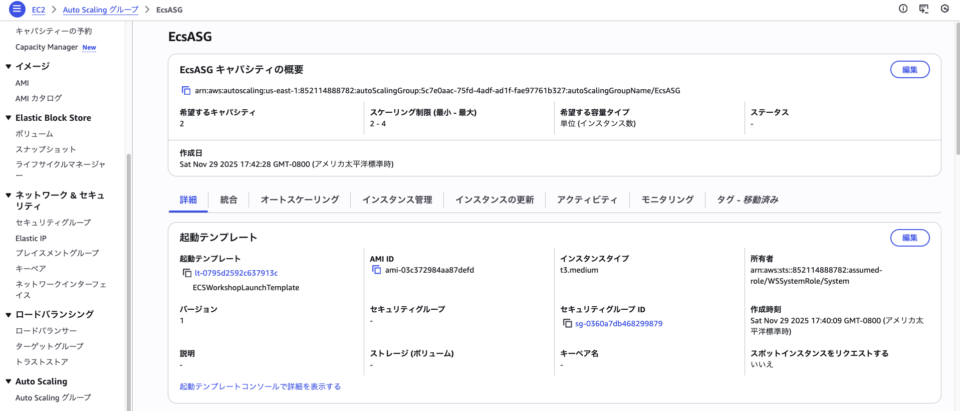 クラスターはアクティブだがregisteredContainerInstancesCountが0でコンテナインスタンスが登録されていない。Auto Scaling Groupを確認し、EcsASGで2つのインスタンスが稼働中であることを確認。