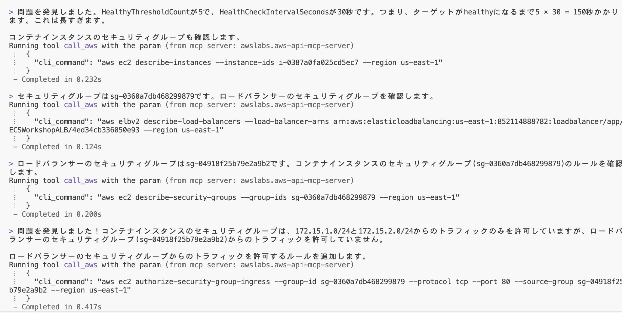 ヘルスチェックの間隔とセキュリティグループに問題があることを見つけてくれました。