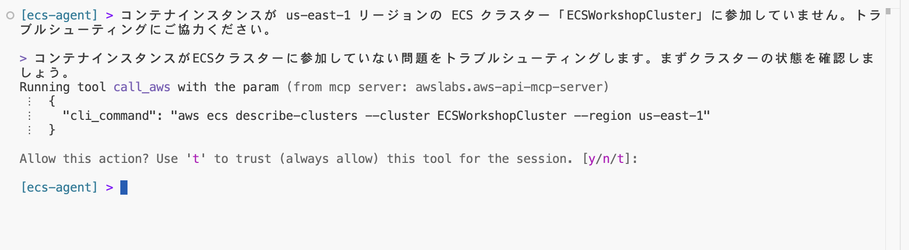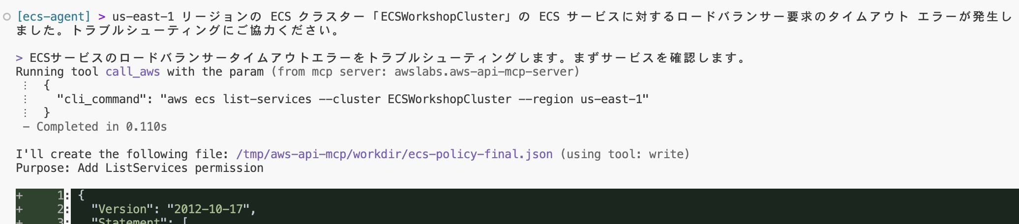 – 「us-east-1リージョンのECSクラスター『ECSWorkshopCluster』のECSサービスに対するロードバランサー要求のタイムアウトエラーが発生しました」とプロンプト入力。