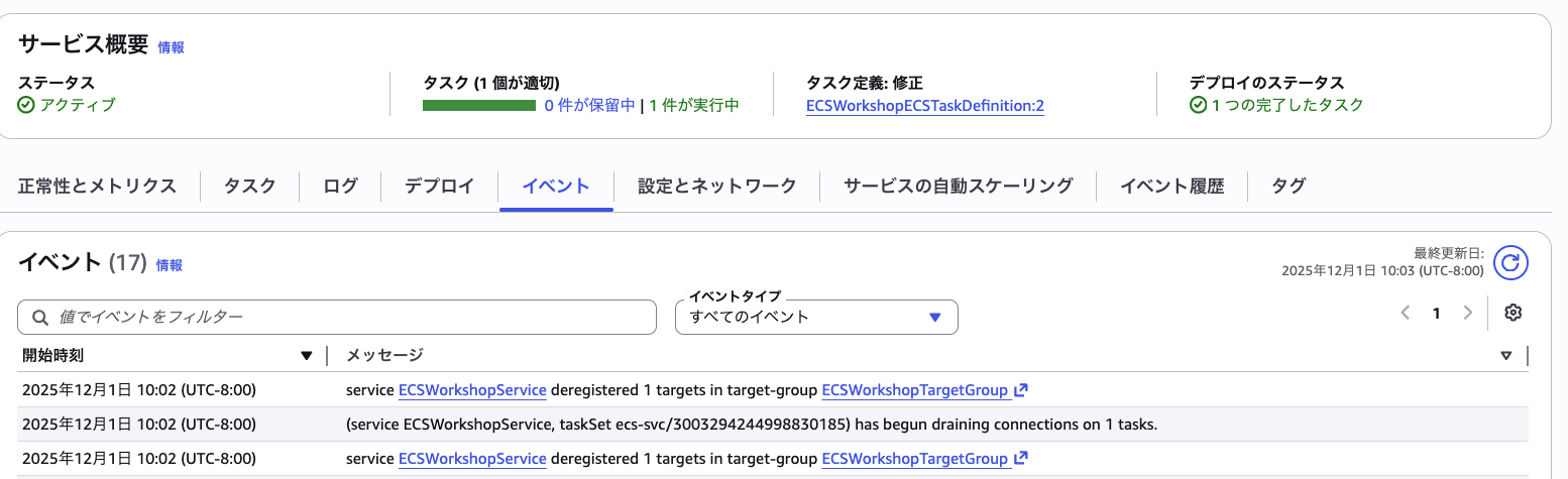 ECSサービスのイベント履歴画面を見るとターゲットの登録と登録解除を繰り返している。